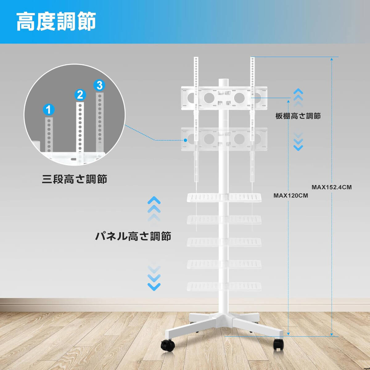 【高さや角度を自在に調節出来る移動式テレビスタンド】 壁寄せTVスタンド 自立型テレビスタンド ハイタイプ 棚板付き 省スペース