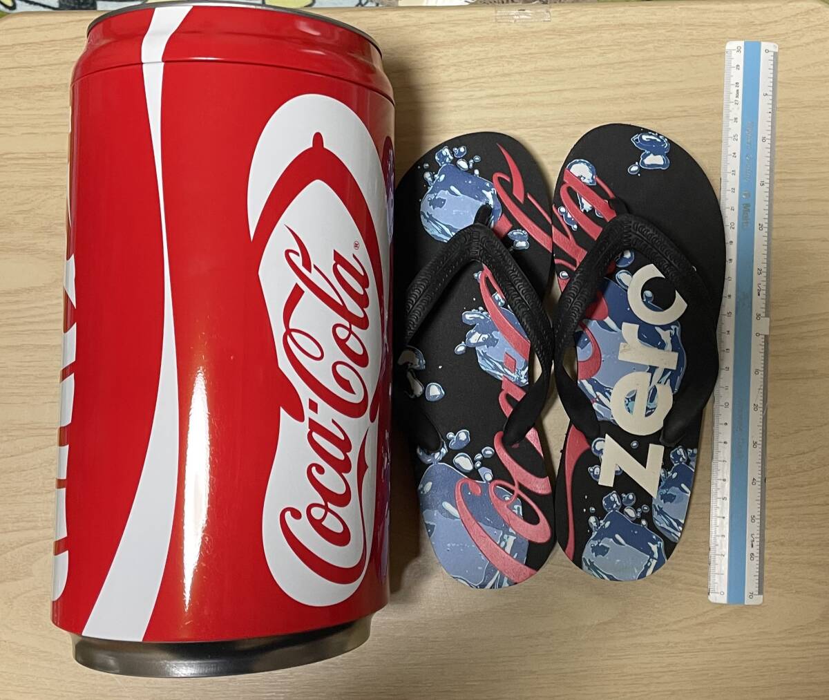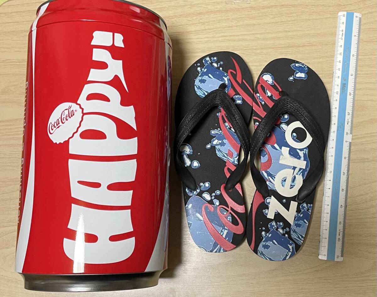 コカコーラハッピーサマー缶。ブリキ製の缶で、蓋があき、中に小物が入ります。ビーチサンダルが中に入った状態でいただきました。缶サイズ、高さ28センチ、直径15センチ。サンダルサイズは不明ですが足サイズが23〜24センチの方に良さそうです。箱の中に入れて、タンスにて長期保管してました。サビはありません、未使用ですがサンダルに多少の劣化?汚れ?が見えます。お安く出品いたしますので細かい事を気になさらない方に。詳細は写真にてご覧下さい。送料は定形外で920円です。
