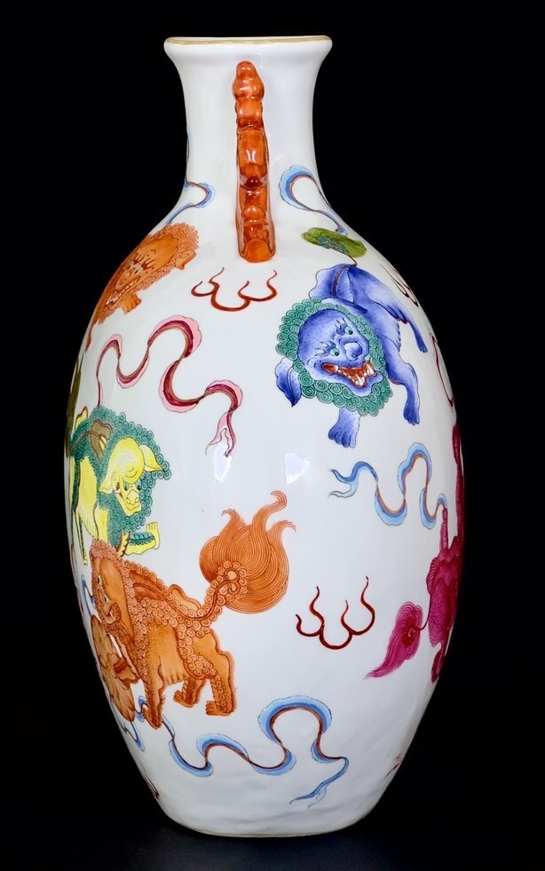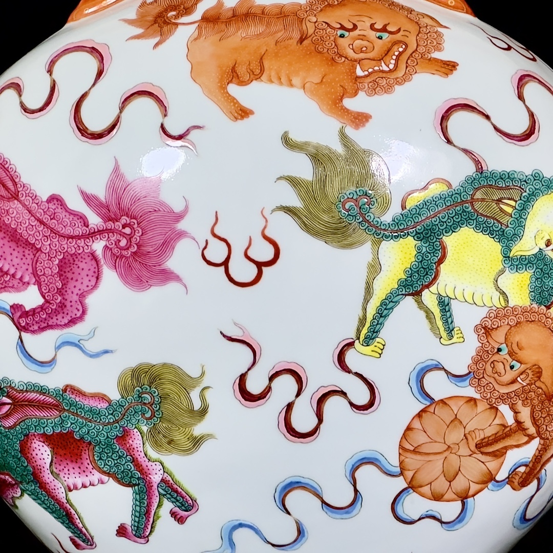 *珍品旧蔵* 清雍正 琺琅彩九獅子紋 扁瓶 中国瓷器 極細工 K1128