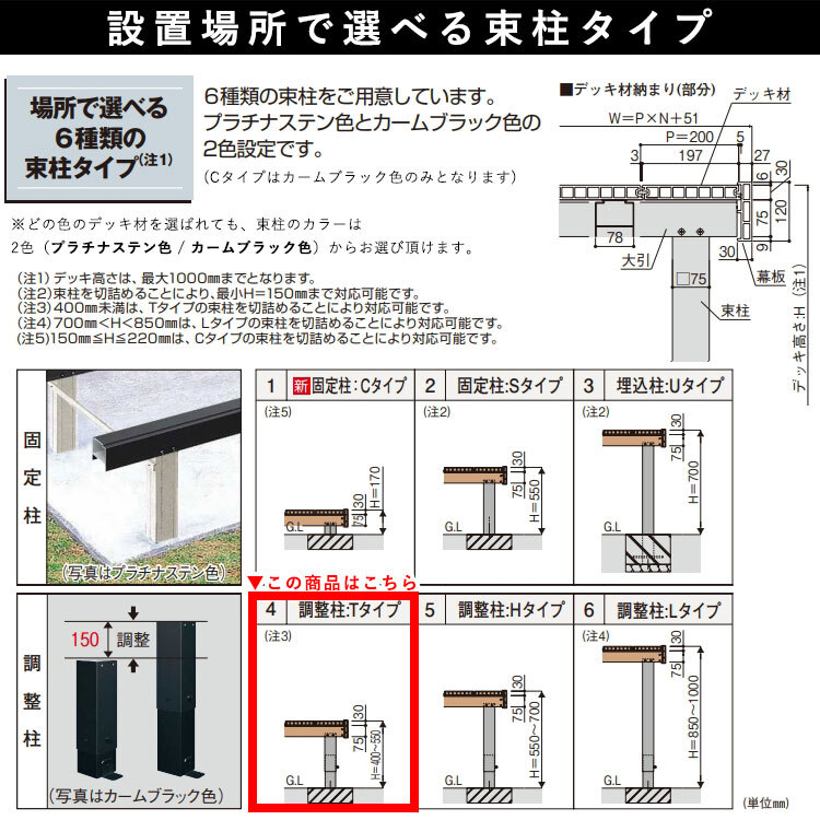 【 標準束柱Sタイプ(地面からデッキ上までの高さ55cm) サイズ一覧はこちら 】