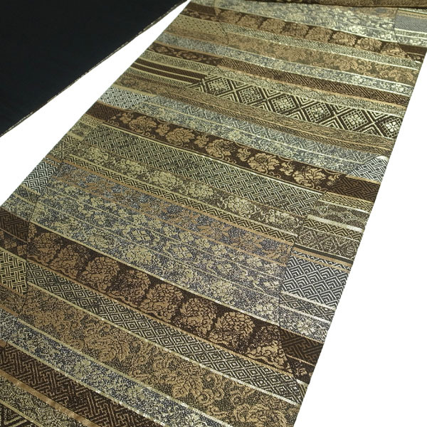 袋帯 京都 西陣 金糸 金 ゴールド こげ茶 茶色 ブラウン 名物裂 花唐草 花兎 フォーマル 結婚式 お茶会 七五三 入卒式 などに おしゃれ オシャレ お洒落 春 秋 冬 正絹 絹 リサイクル リユース 帯 おび オビ 上質 上品 粋 なごみ 中古 仕立て上がり品 kp1719