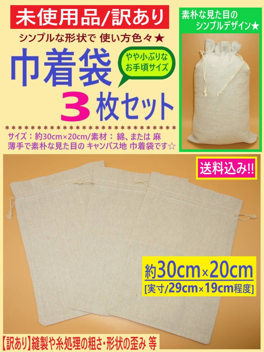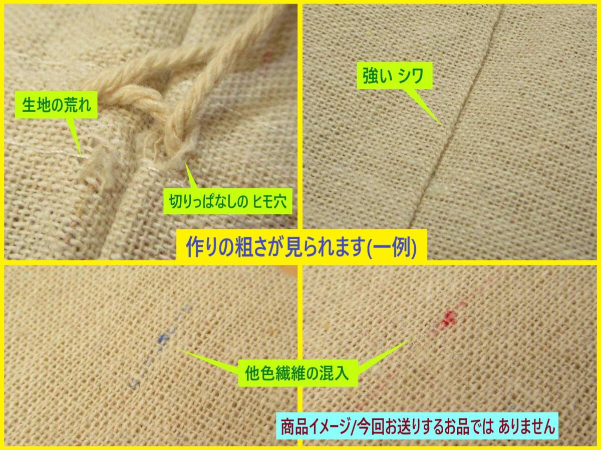 | 「訳あり」扱いの 未使用品です。 専用のパッケージ等の外装は ありません。 キャンバス地素材で出来た 薄手で 素朴な見た目の 巾着袋 3枚セット商品です。 やや小ぶりの 使いやすいサイズなので 日常の小物から 旅行・アウトドア用品の仕分け、 ハンドメイドの素材 またラッピング袋として 他 様々な用途にお使いいただけるかと思います。 基本的なお色は 無地・アイボリー系ですが 生地の所々に 他色繊維の混入が見られます。 また 生地・糸のほつれ・形状の歪み等の 作りの粗さが見られます。 その為「訳あり」として出品いたします。 以下の商品説明をよくご覧になってから、 ご検討をお願い致します。 神経質な方、完品をご希望の方は、 御入札をご遠慮ください。 【商品内容】 無地 シンプルデザインの 巾着袋 同じ仕様の物 3枚セット [基本的な仕様] *個々のお品で 多少の差異があります サイズ:約30cm×20cm [実寸/29cm×19cm程度] 重量:1枚あたり 約30g 素材: タグ等が無い為 正確には不明ですが おそらく「綿」または 「麻」 薄手の キャンバス地素材 その他: ・海外製/メーカー等の詳細は 不明 ・比較的 薄手の生地 *柔らかくなく やや ゴワゴワ系の手触りです(主観) *生地の目は やや粗めの印象です *状態などは画像にてご確認ください *実際の商品の色味とは異なる場合があります *画像1(TOP)~8には 撮影用を使用しています 画像9・10は 今回お送りするお品を撮影しています 【状態等】 ・未使用品です。 ・専用のパッケージなどの外装は、ありません。 ・海外製につき、作りや縫製に粗さが見られます。 美品・完品をご希望の方はご遠慮ください。 ・長期保存品につき、 汚れ・埃の付着等がある場合がありますが、 御容赦下さい。 ・商品は簡易的なチェックのみと させていただいております。 その為、汚れなどの不備を 見落としている可能性があります。 以上の点より「訳あり」として出品いたします。 ご承知をいただける方のみ、 ノークレーム・ノーリターンにて、ご検討下さい。 【補足】 長期保存品、及び、 ゆうパケットにて発送できるサイズに 折りたたんでいるため、 シワ・折れ目が見られます。 画像にてご確認ください。 (発送時の状態 画像10) | ||