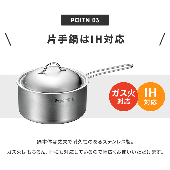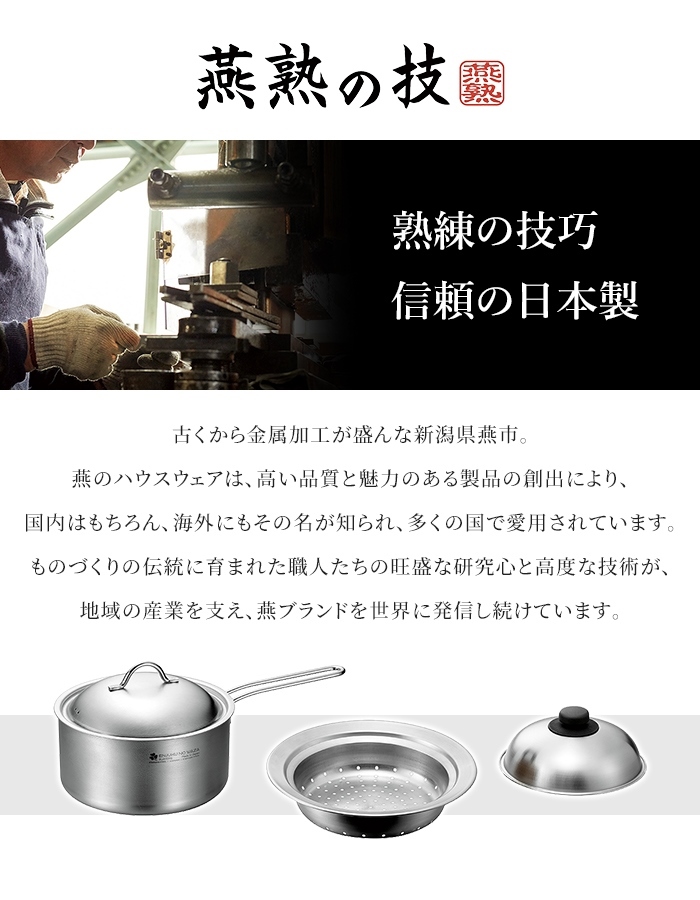 | お手持ちの鍋にのせるだけで手軽に蒸し料理が楽しめる蒸しプレートと片手鍋のセット。 蒸しプレートは温野菜やシュウマイ、中華まんに◎ 片手鍋の本体は、熱伝導性に優れたアルミニウムと耐久性と保温性に優れたステンレス鋼でサンドした3層構造で、軽量で扱いやすく外面のサテン仕上げにおしゃれなロゴ入り。 IHはもちろん、ガス火やオーブン調理、アウトドアでの焚火や炭火にも対応しています。 古くから金属加工が盛んな燕三条の匠が手がけた繊細な仕上げと、伝統技術が詰まったセットです。 |