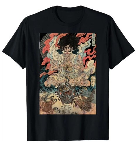 男性用半袖Tシャツ、鬼童丸デザイン、クルーネック、プリント服、カラーブラック