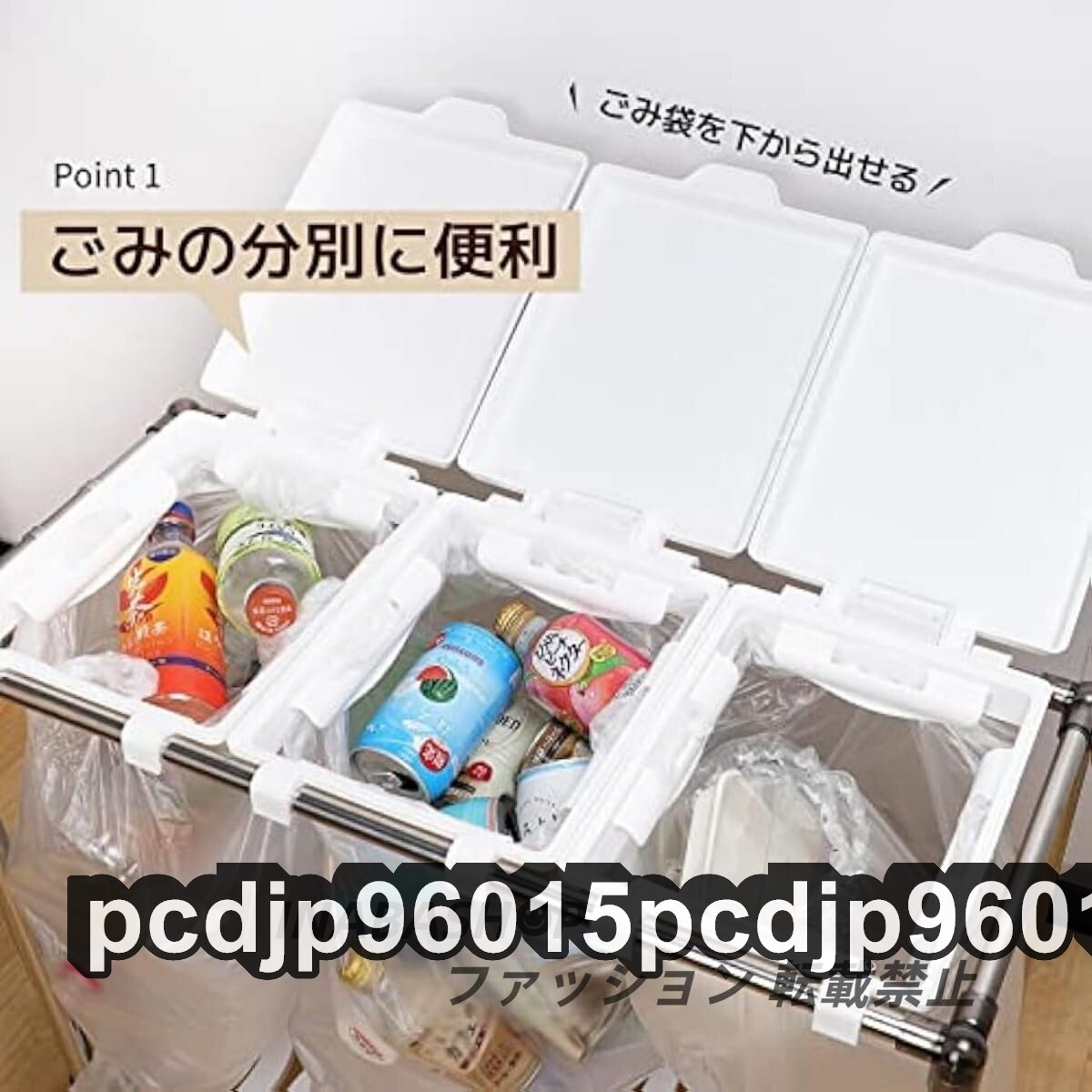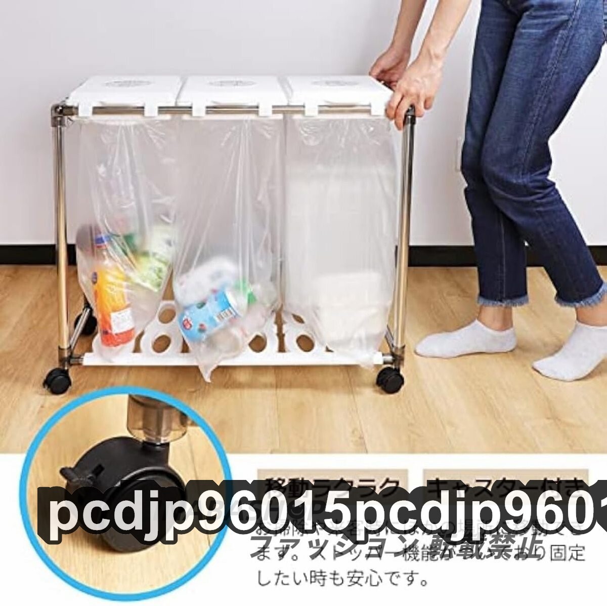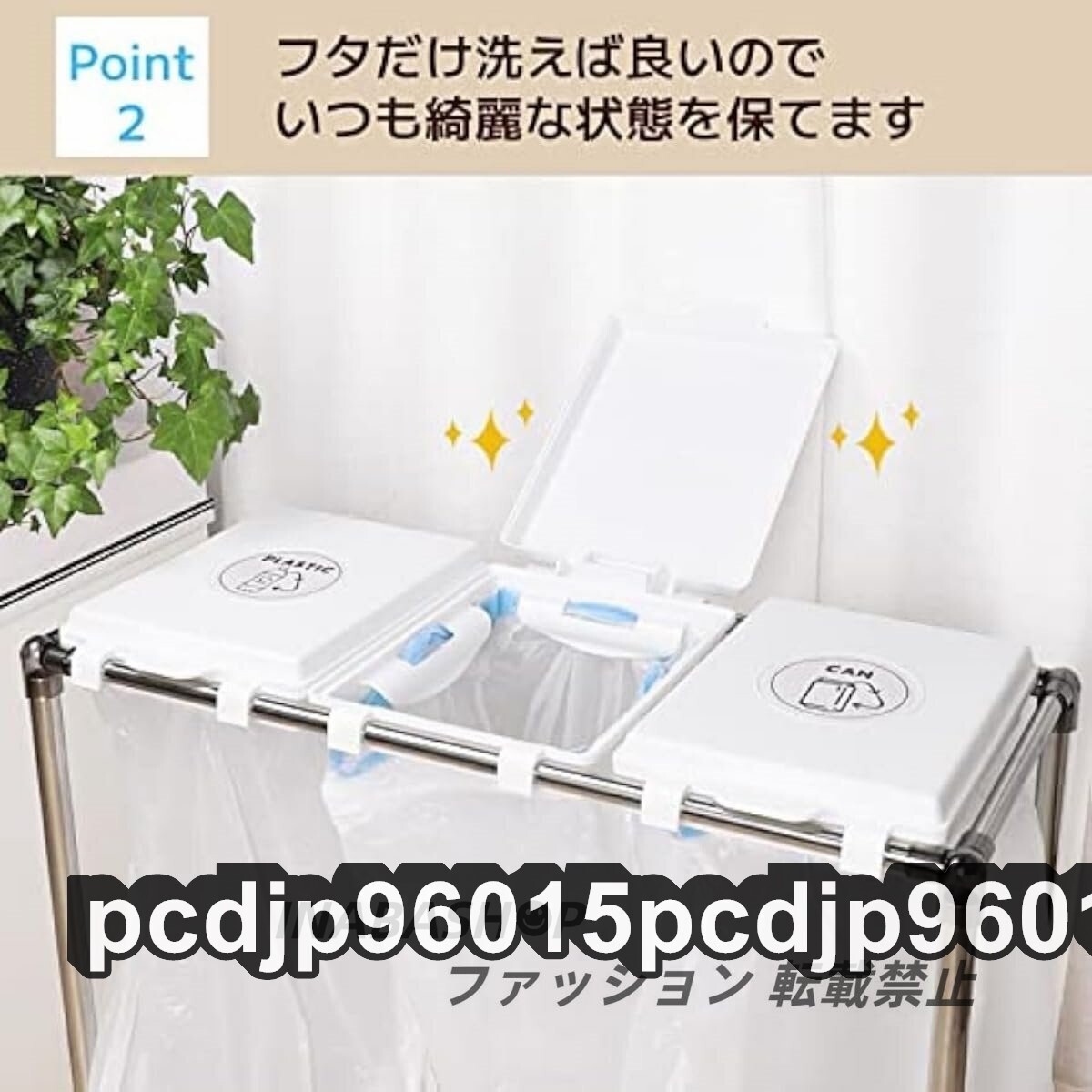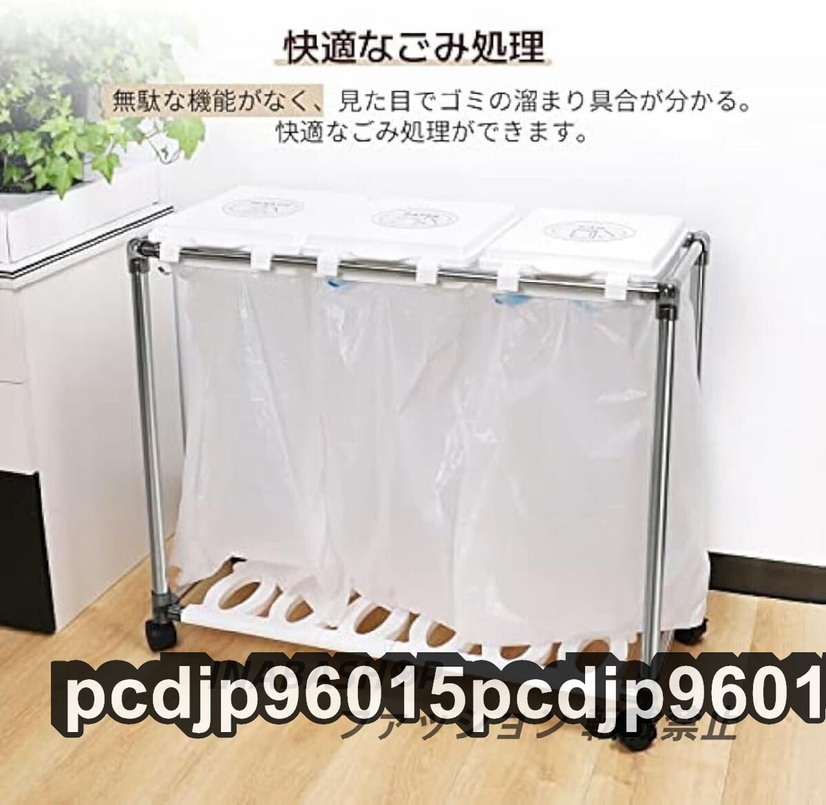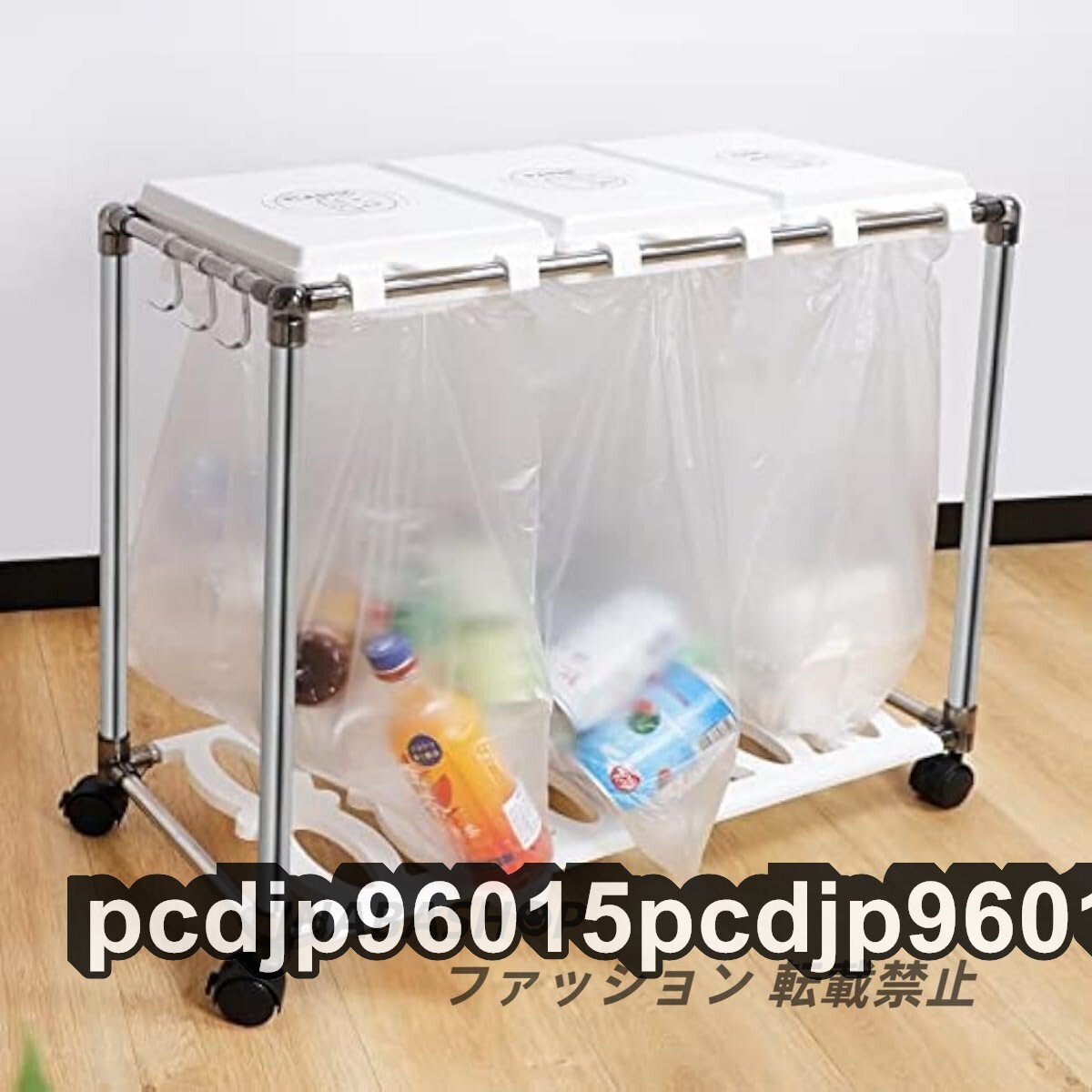 ★状態:新品未使用 【無駄な機能がなく・3分別ゴミ袋ホルダー】ペットボトルや空き缶・ビンなどの資源ゴミの分別に便利なゴミ袋ホルダーです。(投入口サイズ約:19×23cm)一般的な分別ゴミ箱と違って、外装がなく中身が見えるタイプで、ゴミの溜まり具合が一目瞭然なので、捨てるタイミングも計りやすいです。 【5分完成!かんたん組み立て】上下部のプレートは完成の状態でお届けします。ネジを使わないから5分で完成!各パーツをはめ込んで組み立てるだけです。ごみ袋の装着も簡単:ごみ袋を挟んで蓋内部にあるスナップでとめればセット完了です。Point:スナップをとめるには、パイプを握らず、蓋の外縁を握ることでうまくスナップをとめることができます。 【総容量30L×3・袋満載まで入れられる】合計90Lの大容量ながら3分別のゴミ袋スタンド 。箱と違ってビニール袋の柔軟性を利用できて沢山はいります。プラスチック、缶・ビン・ペットボトルなど、色々な種類のゴミ箱を置く必要無し、1台だけでスッキリ分別が可能です。本製品は、一般家庭用の20~30L用ゴミ袋最適な分別ゴミ箱です。 【安定感のあるステンレス製パイプ】ごみ袋ホルダーは直径2cmのステンレス製パイプでしっかり支え、錆びにくい特徴もあります。分別ダストワゴの底部にスイスイ動くキャスターが付き、お掃除の際の移動もスムーズです。4脚にロック機能付きのキャスターで足元を固定してぐらつき防止できます。 【便利さにこだわった分別ゴミ箱】①底面には、ごみ袋の保管にも便利なフレームが備わって、ゴミ出しの時の袋の交換がスムーズになります。大きなゴミ袋でも床に擦れて破ける心配なくセットできます。②サイドフックは普段あまり出ないゴミや溜まるのに時間がかかるようなゴミの指定位置に、例えば乾電池やブルダブなど小さいな分別におすすめです。