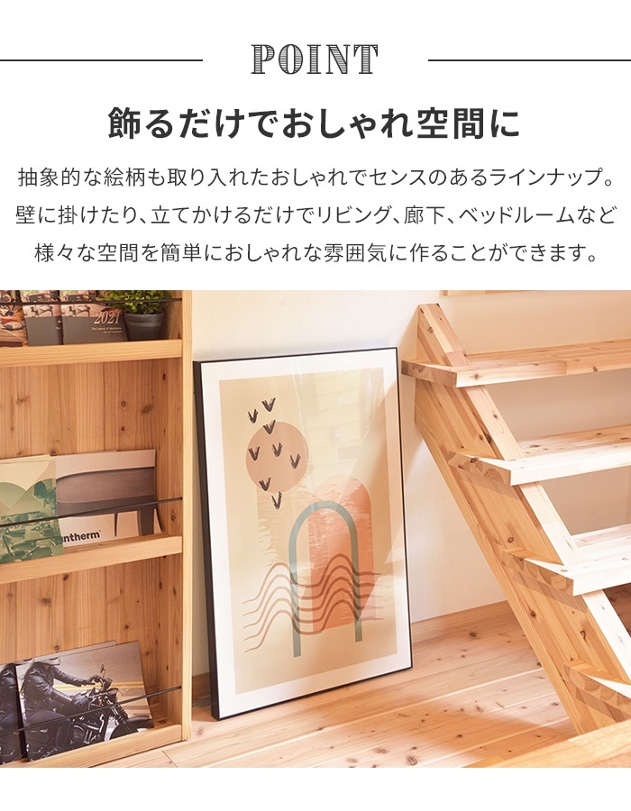 | 壁に掛けたり、立て掛けるだけでリビング、廊下、ベッドルームなどの空間を簡単におしゃれな雰囲気に作ることができます。 |