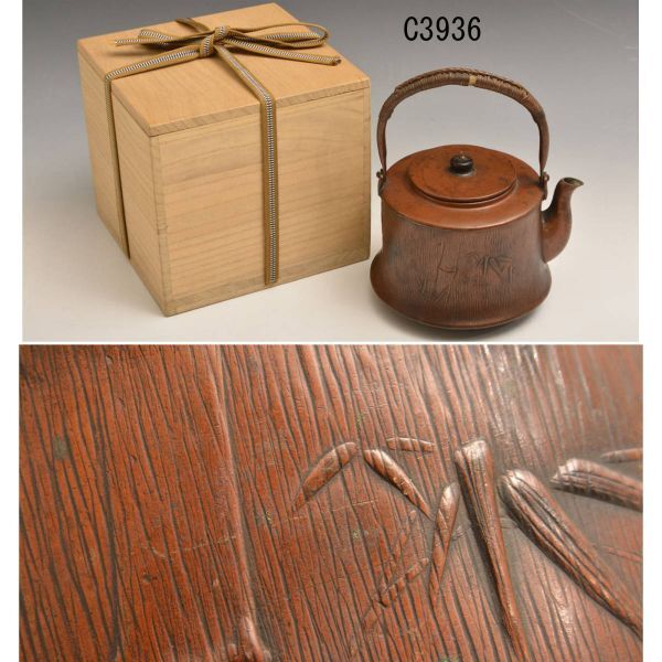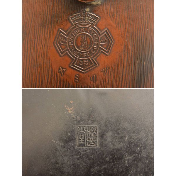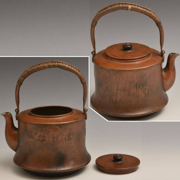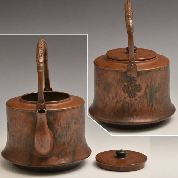 状態:全体に擦れあり。胴や肩にでこぼこ少々。取っ手のつるに傷み少々。蓋袴部分にでこぼこ少々。底に「松○堂」、取っ手下部に「プリミヤ」などの銘あり。合箱。