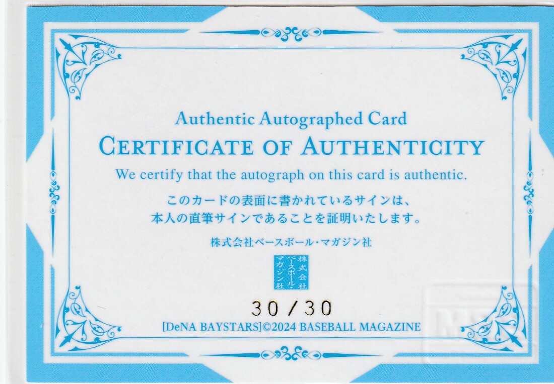 パックから出る直筆サインカードでシリアルナンバーが入っています。シリアルナンバーは30/30のラストナンバーです。画像にはスキャナーの埃や縦線が写っている場合がありますが現物は美品です。
