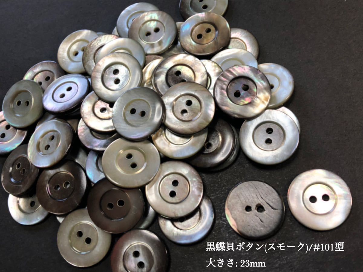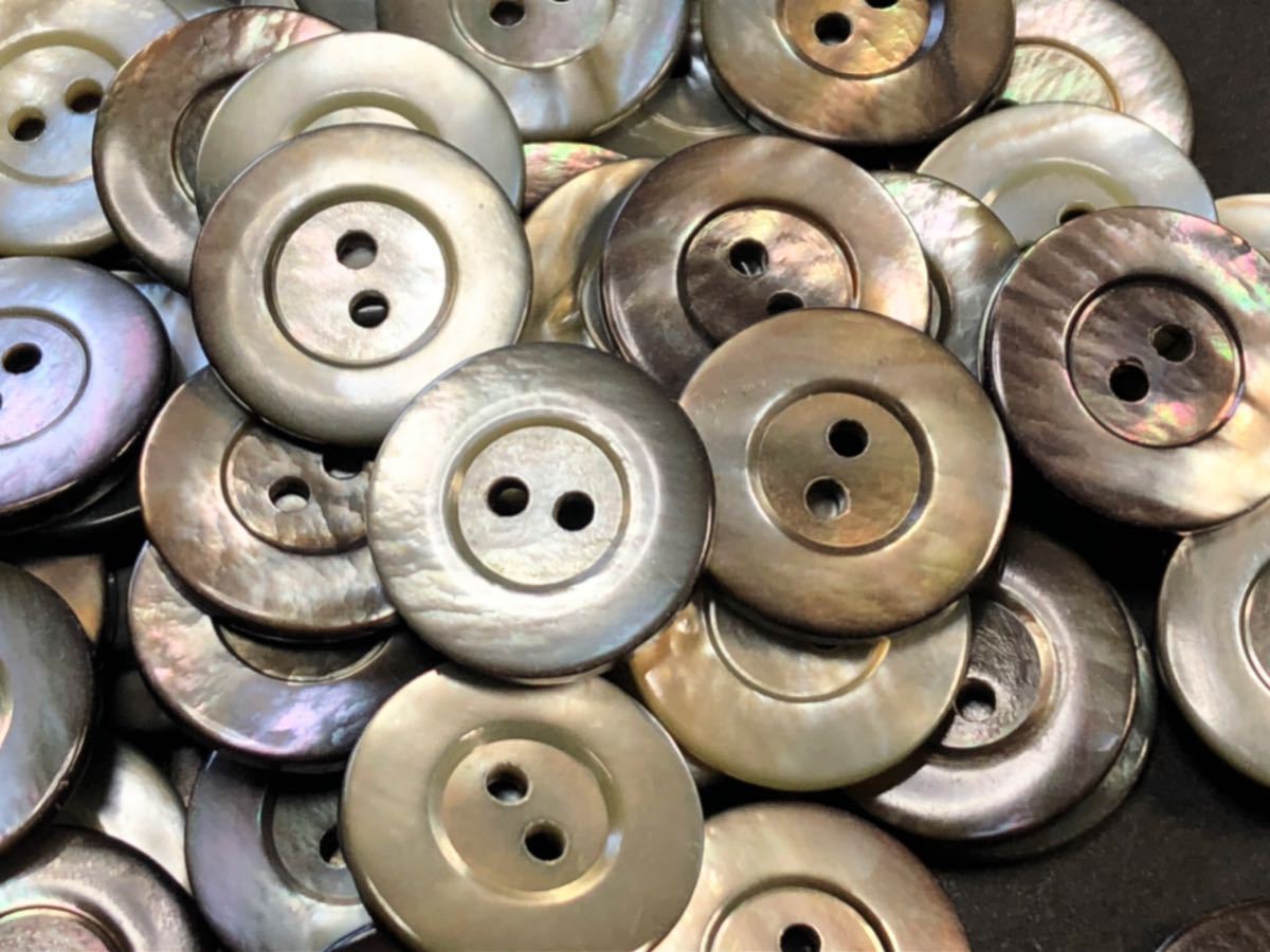 ヨーロッパ仕様のボタンで黒蝶貝をスモーク染めしています。