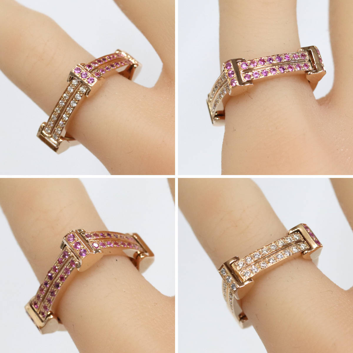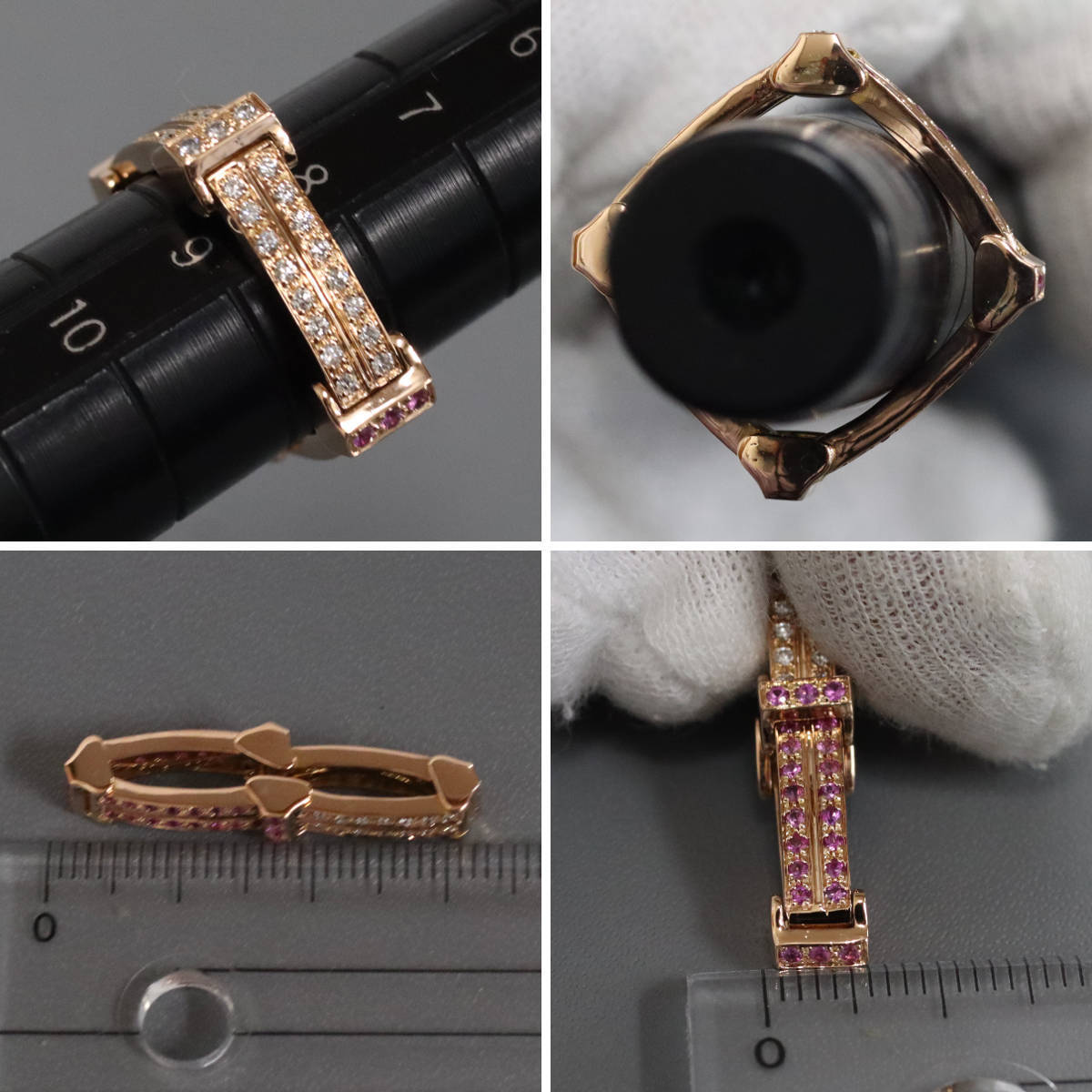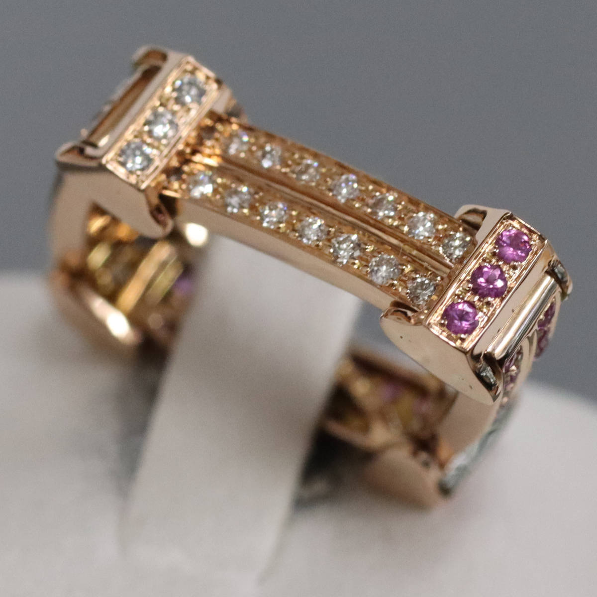 K18PGピンクサファイアダイヤモンドペンダントトップの中古品です。 ピンクサファイアとダイヤモンドがセットされており、気分によって写真2枚目のような使い方が出来ます。 約9号サイズの指輪としてもご使用になれます。 地金に小傷があります。