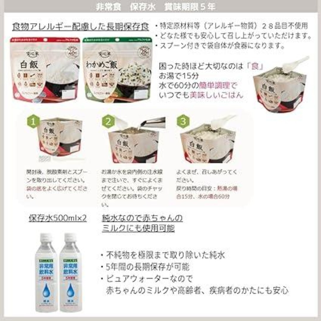 食料・水:アルファ化米(5年保存)【白飯、わかめ各1袋】、純水(5年保存)【2本】