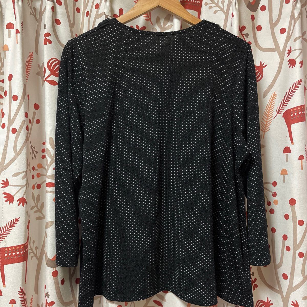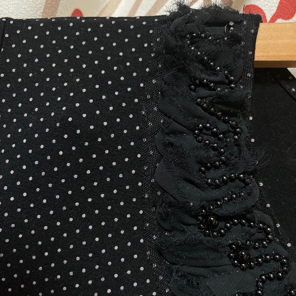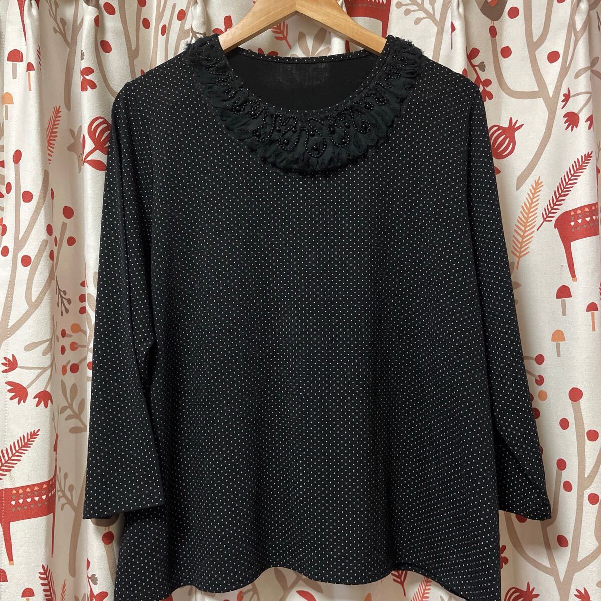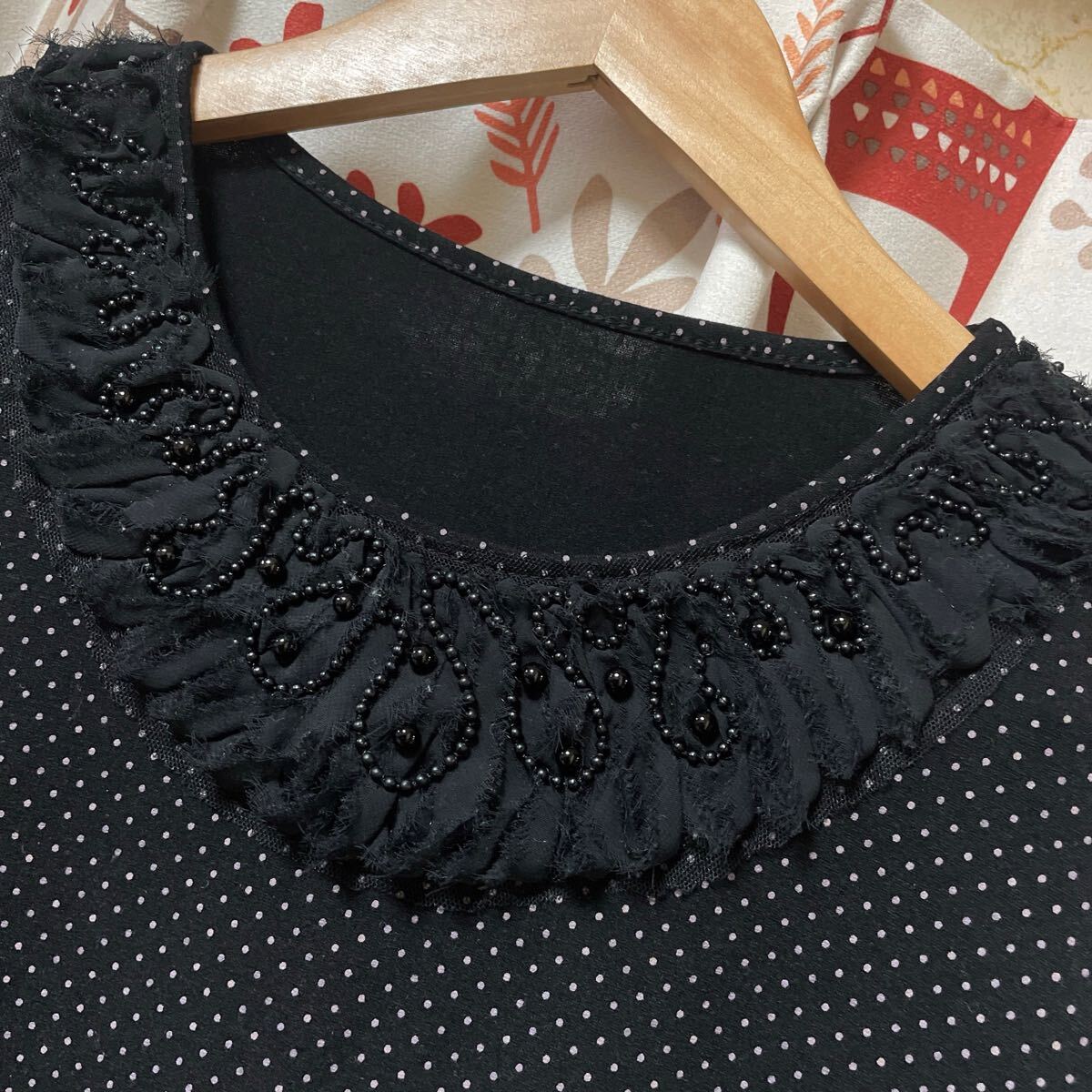 ◆小さなドット柄に胸元にシフォン生地とビーズの飾りがついた少し落ち感ある素材の長袖カットソー