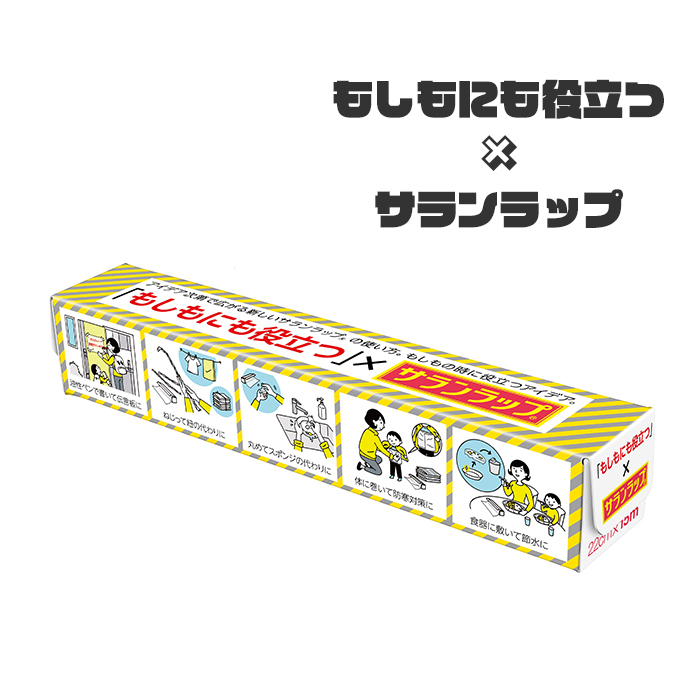 | サランラップ コラボ もしもに役立つ ラップ アイデア 知恵 伝言板 紐 スポンジ 防寒対策 節水 緊急 非常時 避難 災害 震災 水害 万が一の備え 屋外 レジャー キャンプ アウトドア イベント 景品 ノベルティ 行事 くじ ガラポン もしもにも役立つ サランラップ |