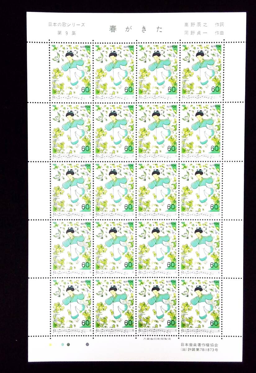 日本の歌シリーズ第9集「春が来た」岡野辰之作詞 高野貞一作曲 60円×20枚 1シート 1981年3月10日発行 未使用 記念切手