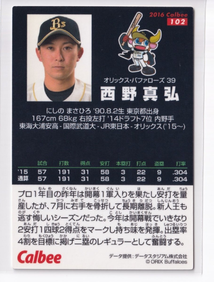 2016プロ野球チップス第2弾 102 西野真弘(オリックス)