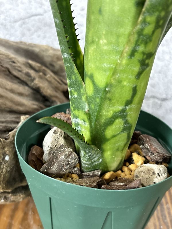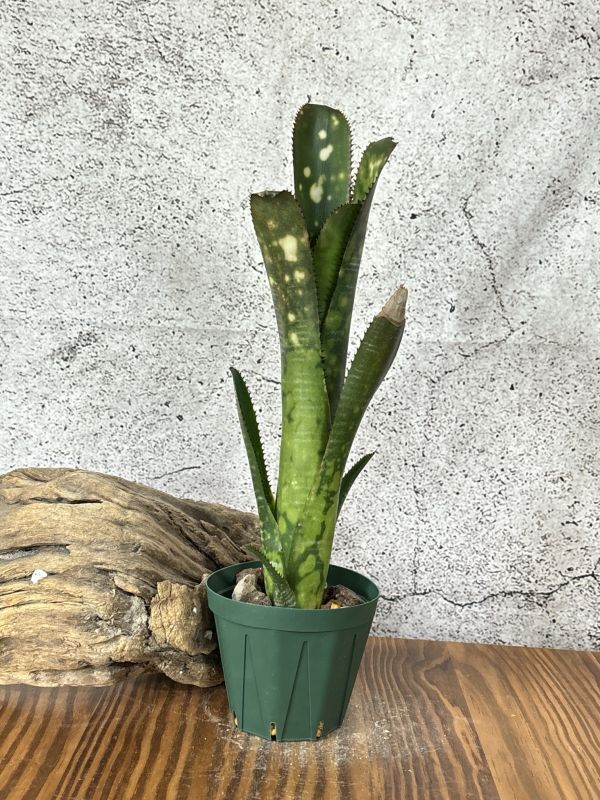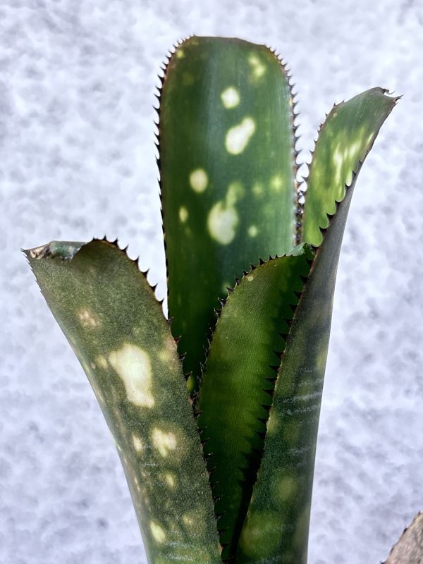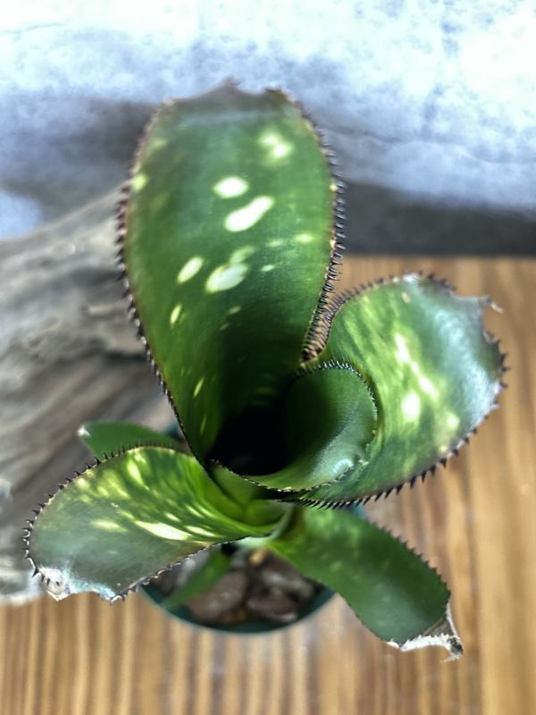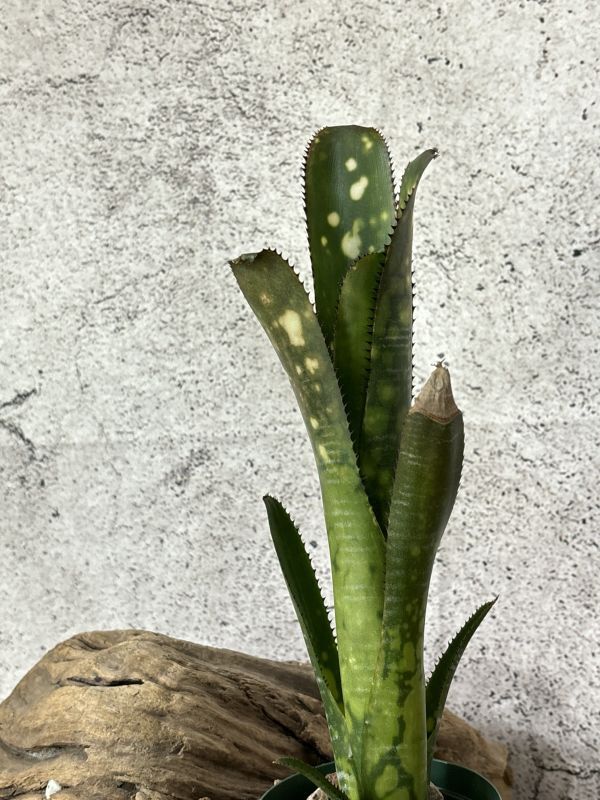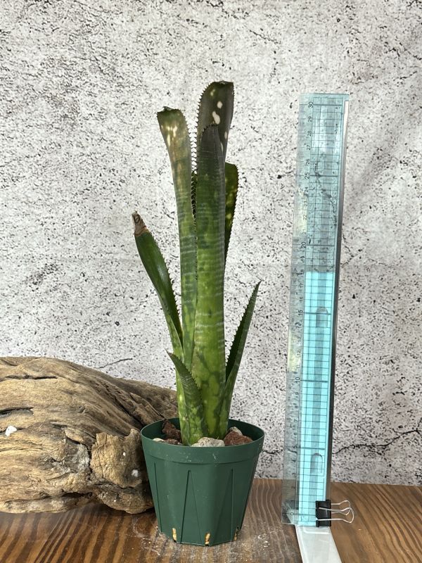ビルベルギア・トンプライ トラフィックジャムはビルベルギアの栽培品種の一つ。 タイの有名な育種家Thongduang Kosol氏作出のトンプライシリーズの一つ。 日本ではあまり流通しない珍しビルベルギアのシリーズで美しく、魅力的な姿をしているものが多いです。 「渋滞」の名を持つトンプライシリーズの品種。 葉は硬質で黒い葉針が細かく密にあります。葉はまっすぐ垂直方向を向いていて引き締まった筒状の草姿をしています。 葉の色は明るいグリーンで白い大きなスポットとし白い斑模様が入ります。 画像の定規は30cm定規になります。おおよそのサイズの参考にしてください。 ※タンクブロメリアは植え付けてまもないため発根してない可能性があります。 グラつき、輸送時の衝撃で鉢から抜けてしまうことがあります。予めご了承ください。 画像の現品をお届けになります。 画像撮影日時2024/11/12頃