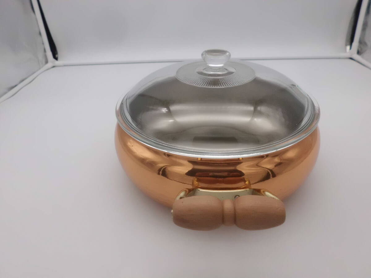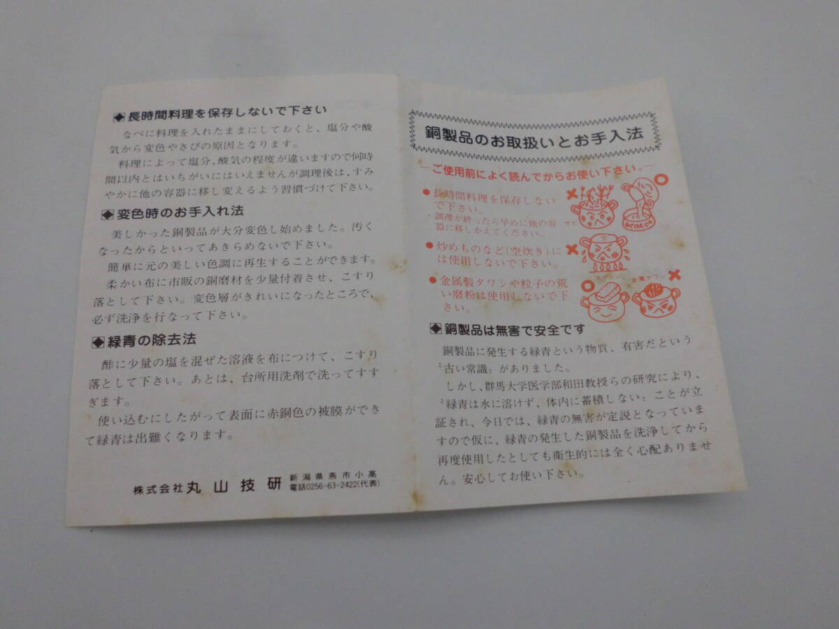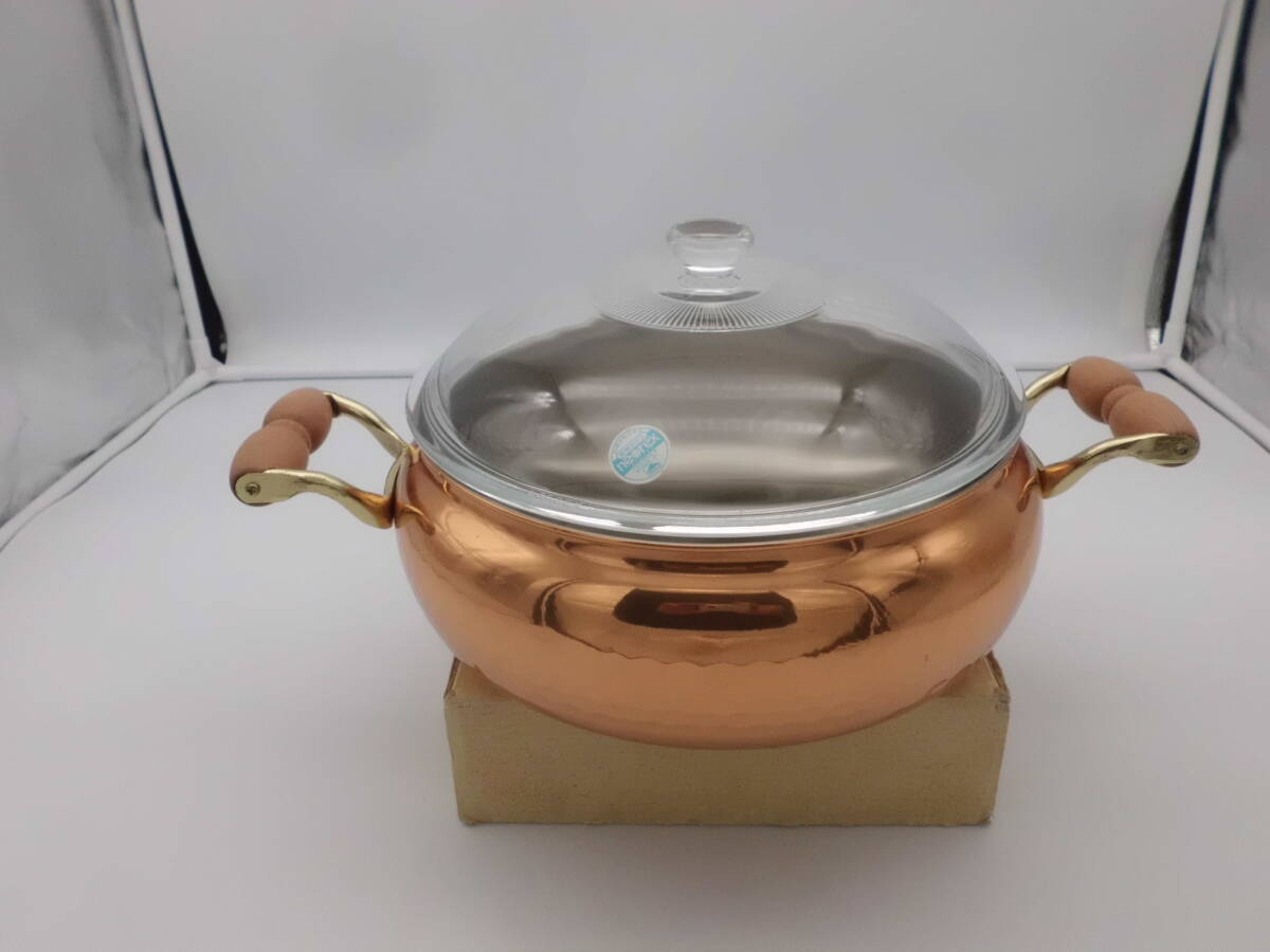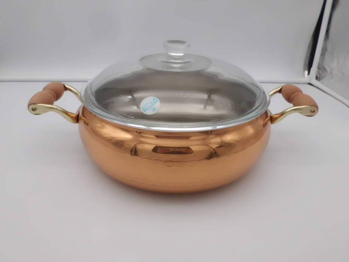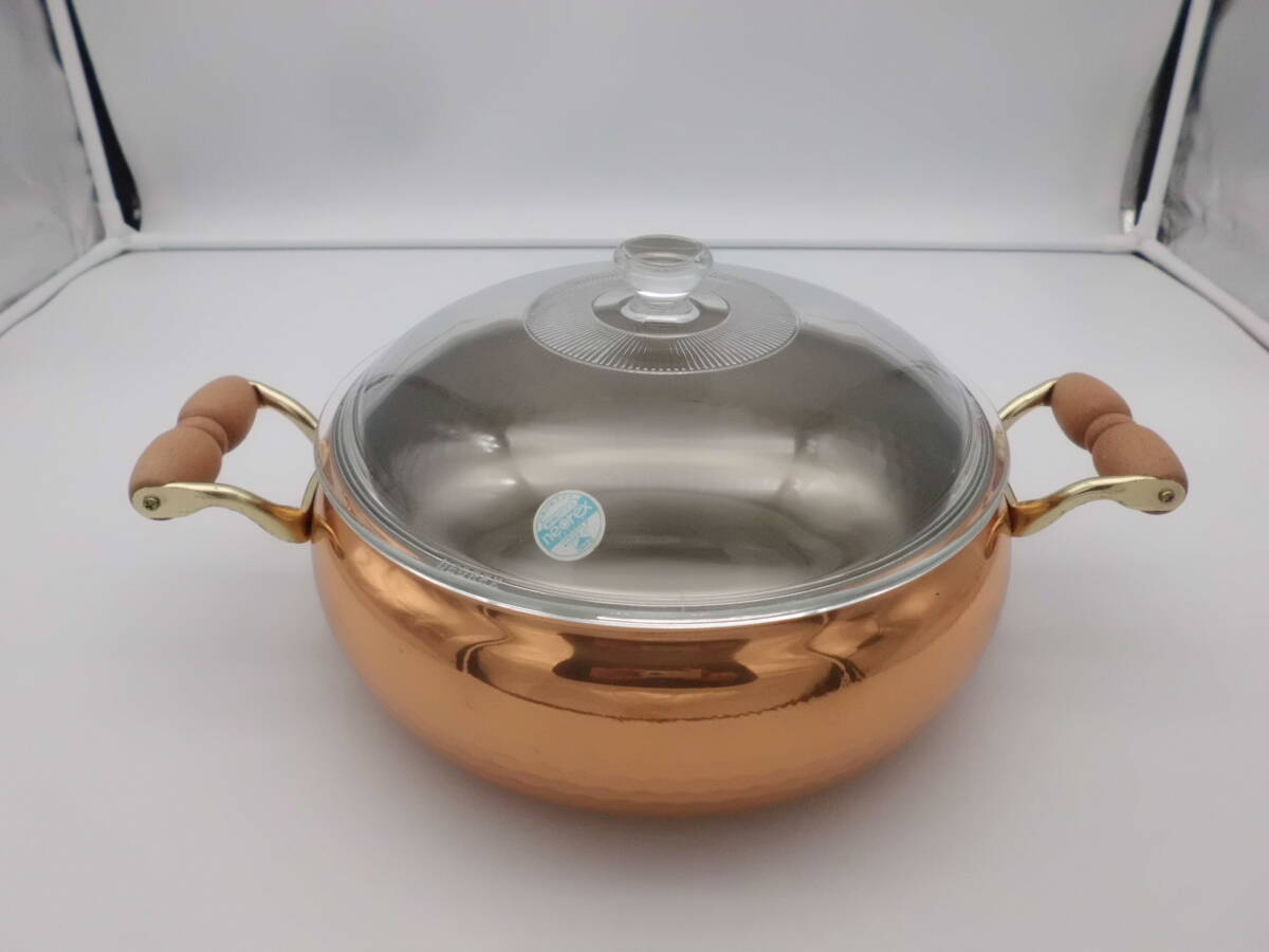 ■ 丸山技研(純銅)両手鍋(23cm)(日本製)(元箱無し)  サイズ(純銅・両手鍋)直径約 23cm  深さ約 9cm 高さ約 9.5cm (持ち手から持ち手まで)約 36.5cm(蓋)耐熱ガラス(ネオレックス) (日本製)(新品・未使用の商品ですが長期保管品の商品の為スレ・汚れ等ある場合がございます。)細かく確認が出来ておりません。お気になさる方は入札の方はご遠慮下さい。撮影の為、箱から出して撮影させて頂きました。ご理解のほど宜しくお願い致します。(写真に映っているものが全てです。)(完品をお探しの方及び細かな事がお気になさる方及び神経質な方及び日本語がご理解出来ない方は入札の方はご遠慮下さい。)元箱が悪い為、別の箱に入れて発送の方させて頂きます。お気になさる方は入札の方はご遠慮下さい。(元箱無し)
