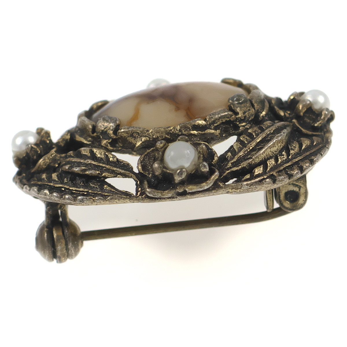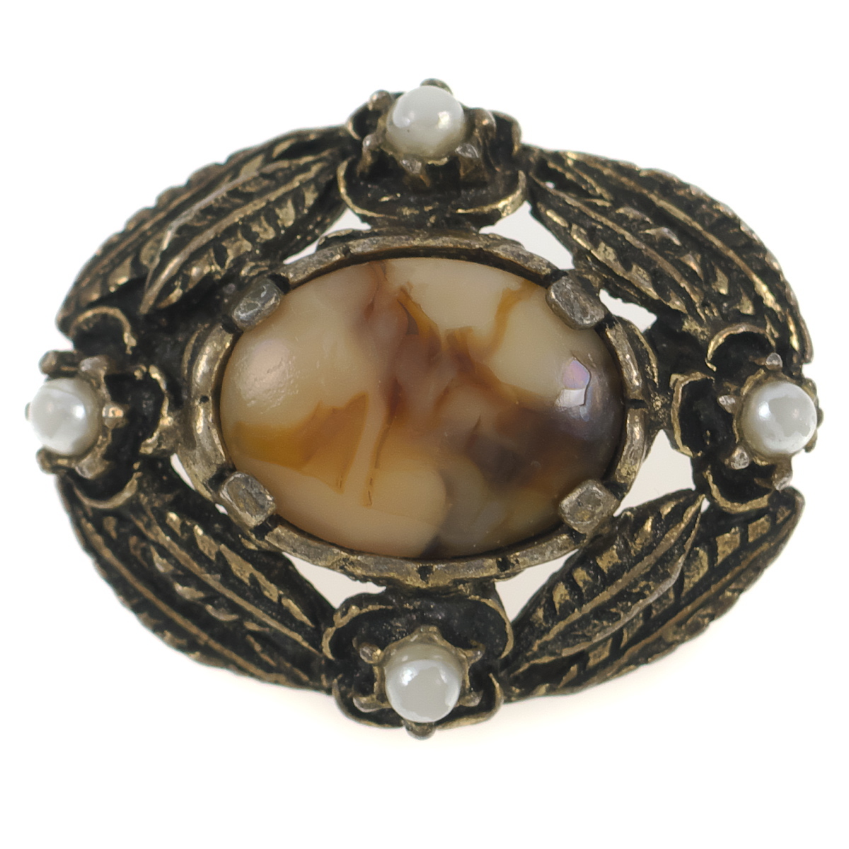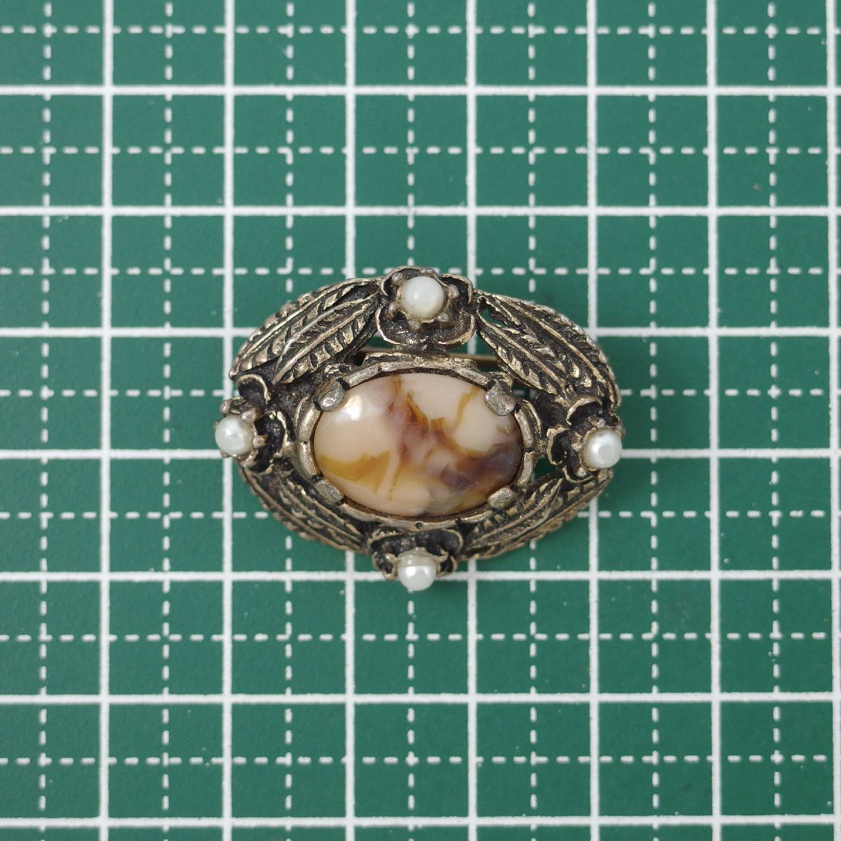 UK2664◆【MIRACLE】◆ リーフモチーフ ベージュ系マーブルストーン&フェイクパール ミラクル 英国 イギリス ◆ ヴィンテージブローチ