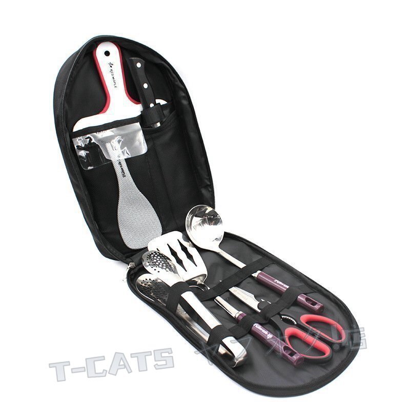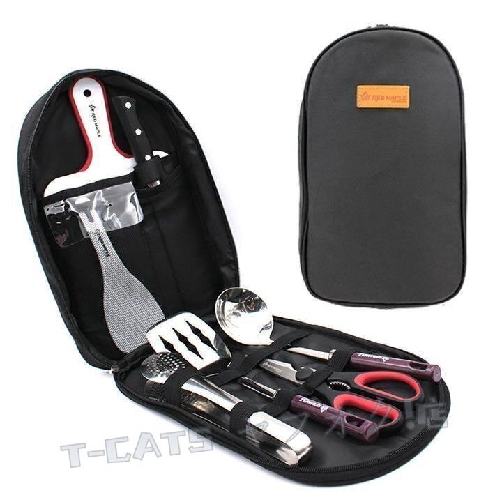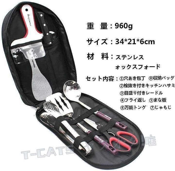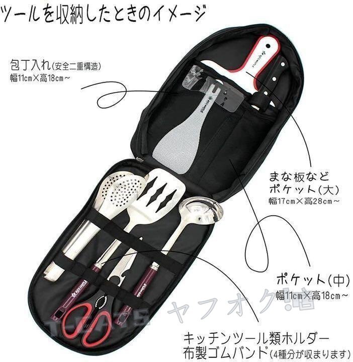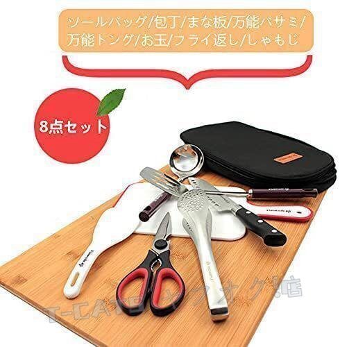 【セット内容】 ツールバッグ、包丁、まな板、万能バサミ、万能トング、お玉、フライ返し、しゃもじ。