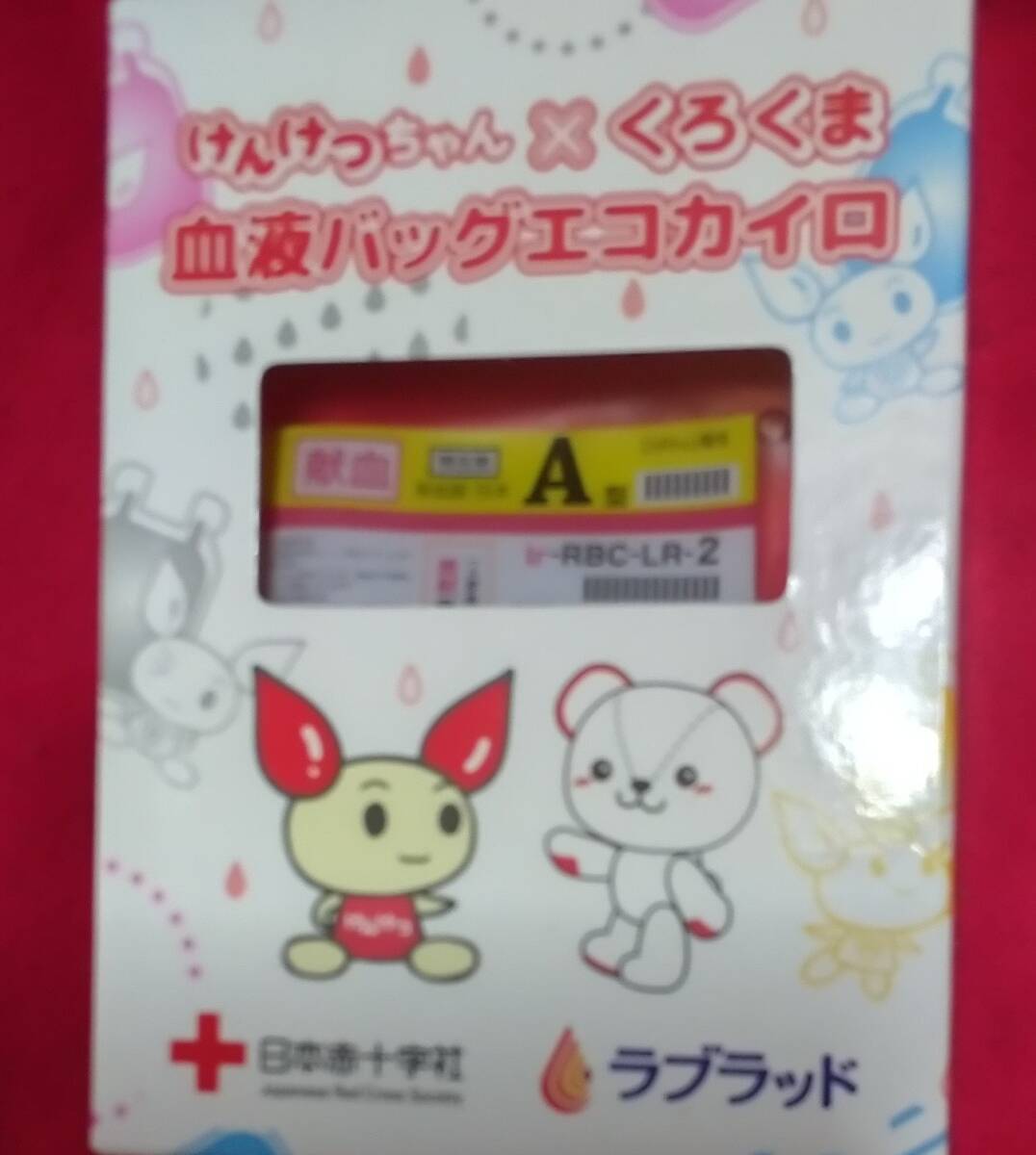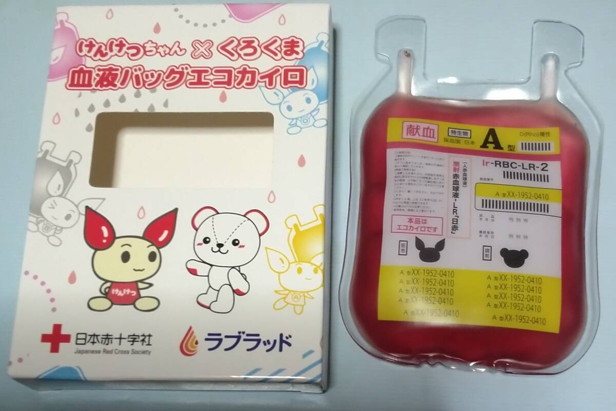 献血御礼にいただいた献血ちゃんとクロクマの献血バッグエコカイロA型です。