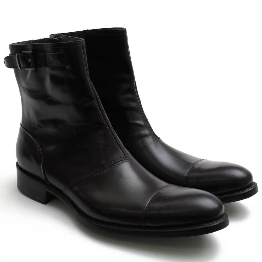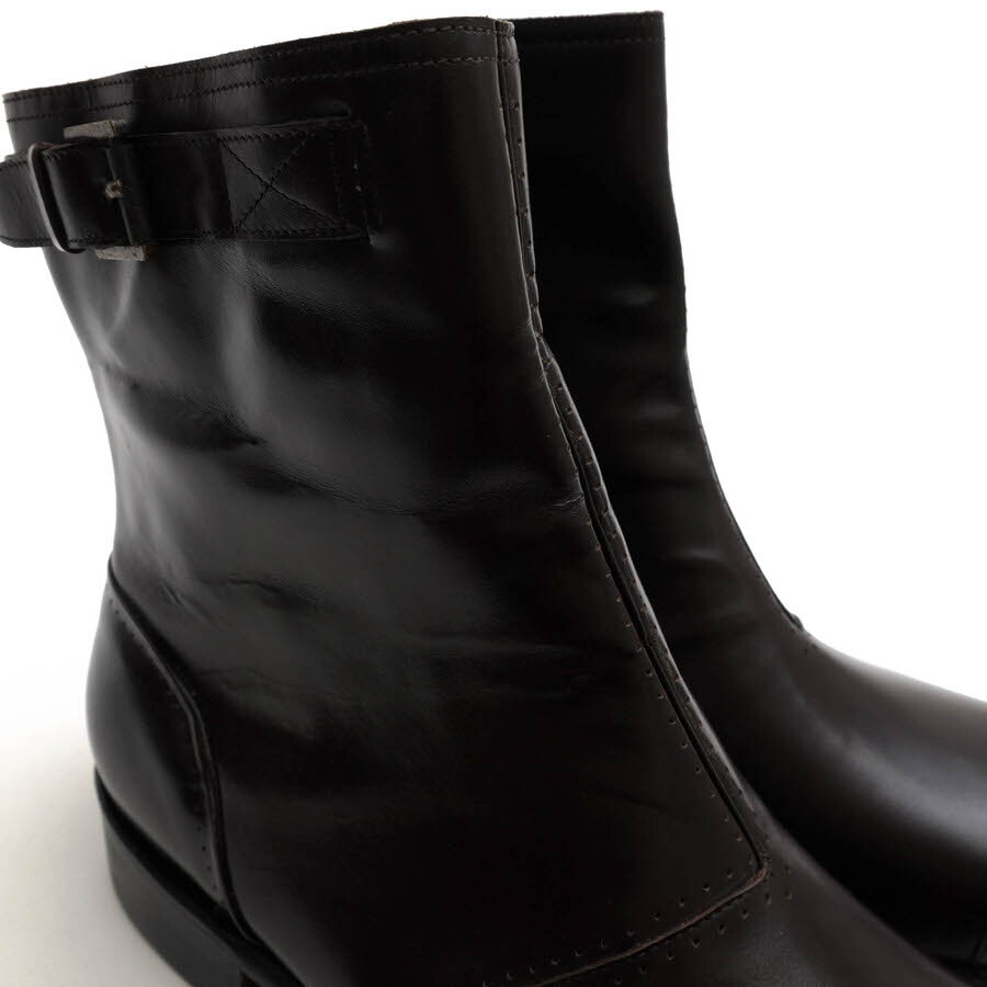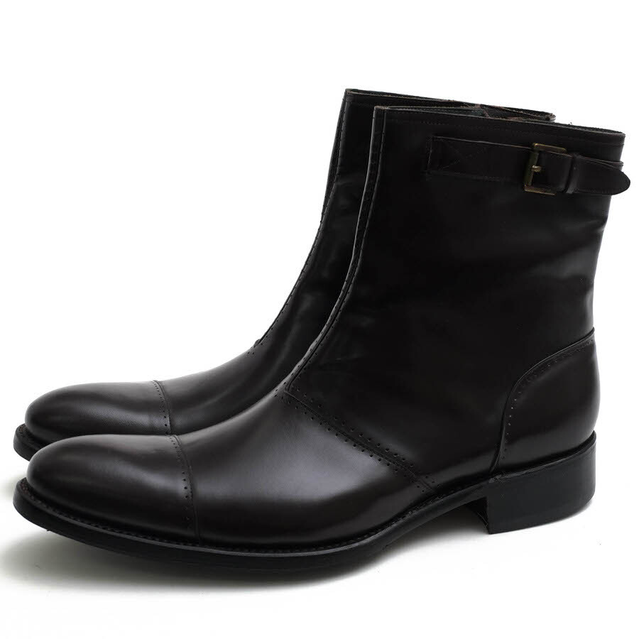 | アルフレッドバニスターのレザーブーツ。ストラップがアクセントになっています。どんな服装にも合わせやすいシンプルな黒のブーツは、無骨な中にも繊細さを感じさせ、足元をオシャレに演出してくれます。また、こちらはサイドジップが付いているので、着脱もしやすく機能的。 |
