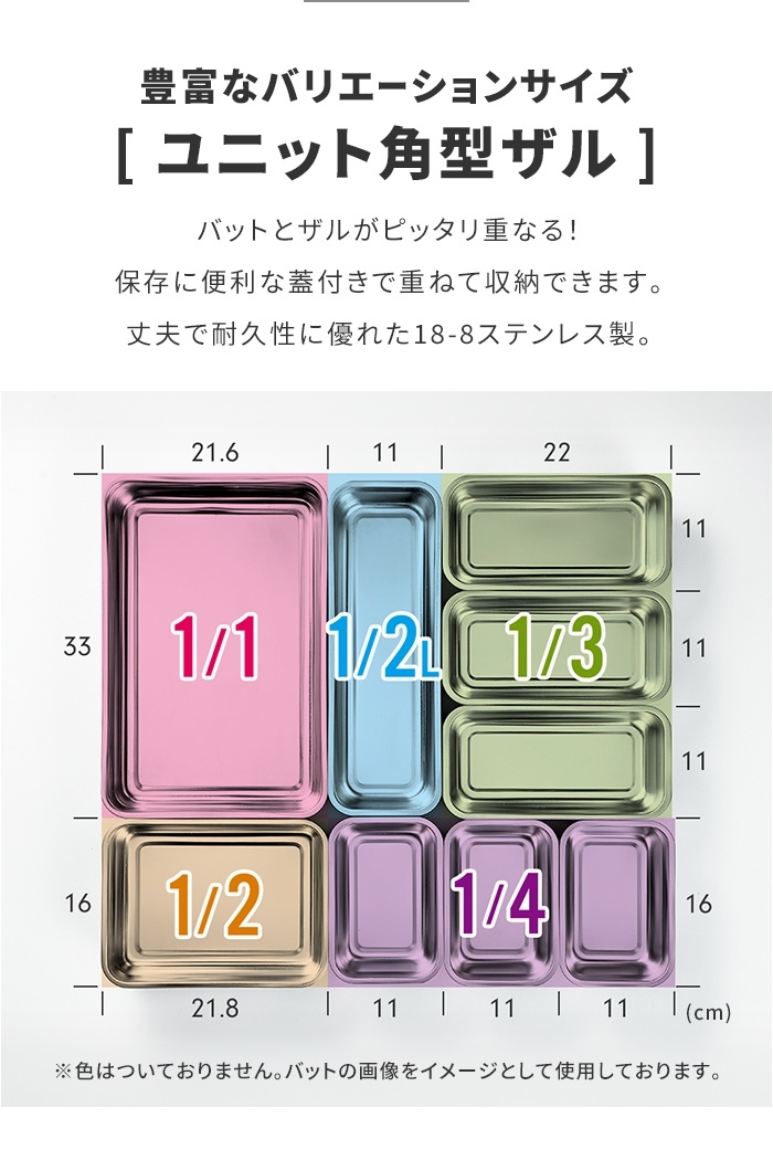 バット(size:1/4)、ザル、フタ×各2組&バット(size:1/2L)、ザル、フタ&バット(size:1/1)、ザル、フタセット