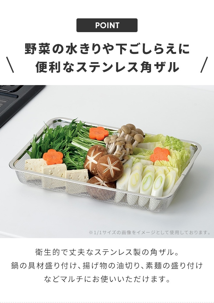 使いやすい小型サイズながら、野菜の水切りや料理の下ごしらえ等キッチンで重宝する、便利で頼りになるザルです。