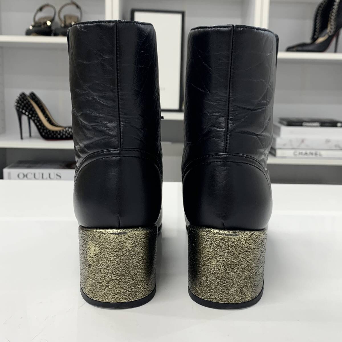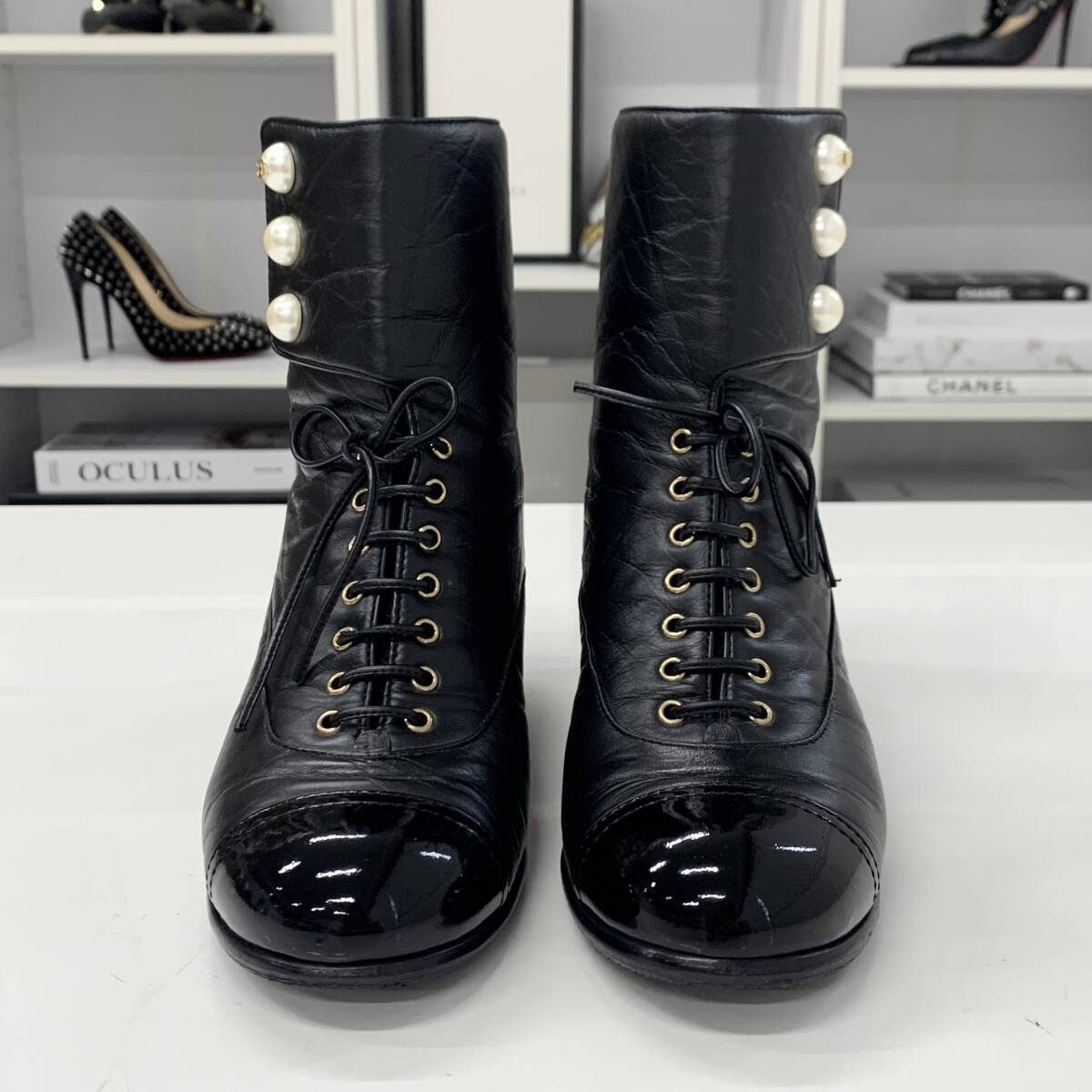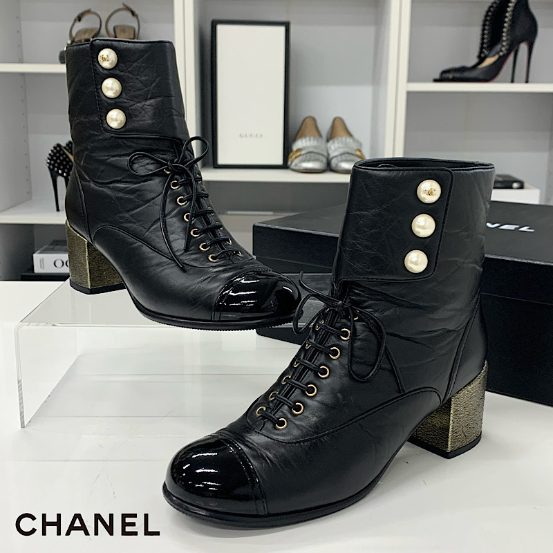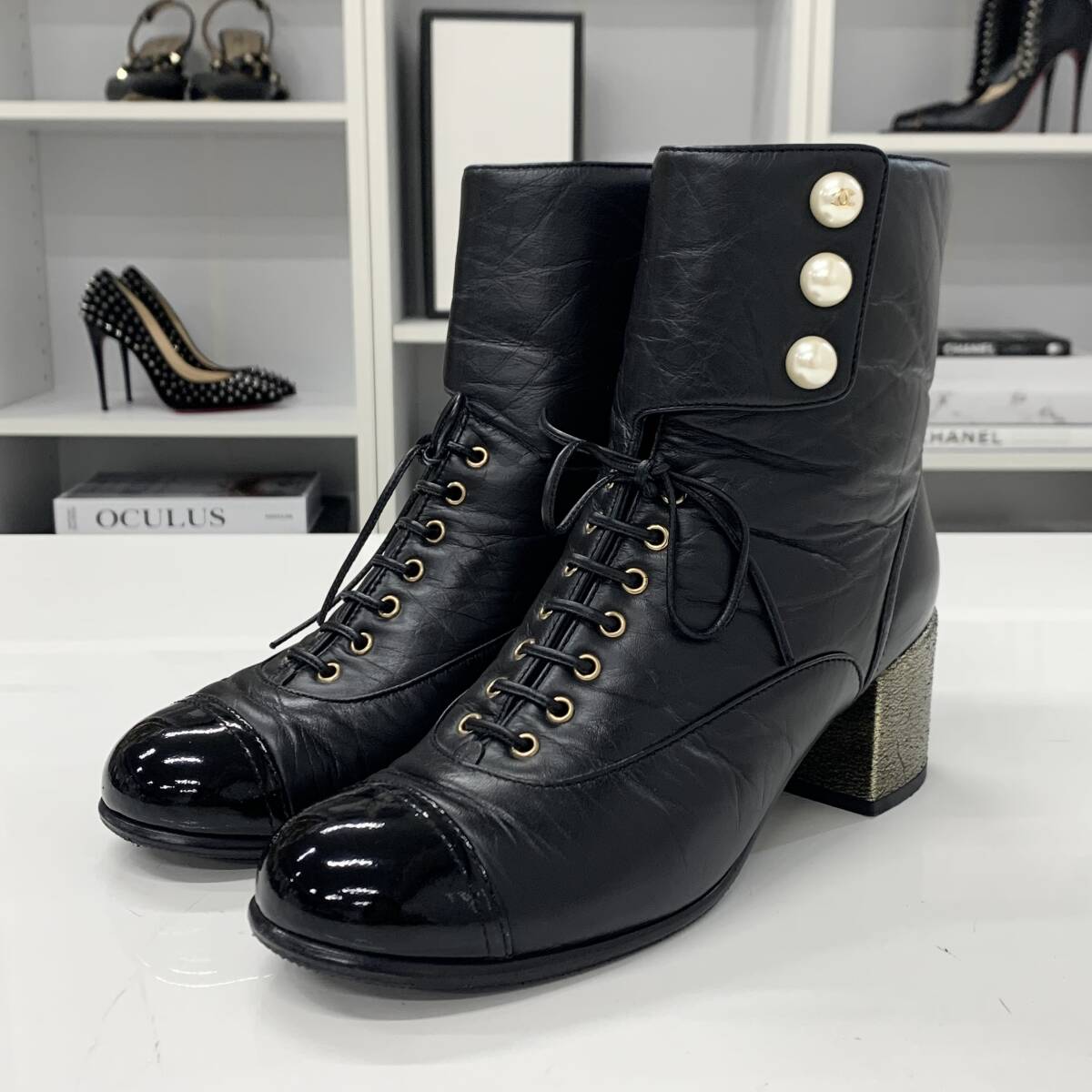M10984 シャネル レザー ココマーク パール シワ加工 レースアップ ショートブーツ ブラック
