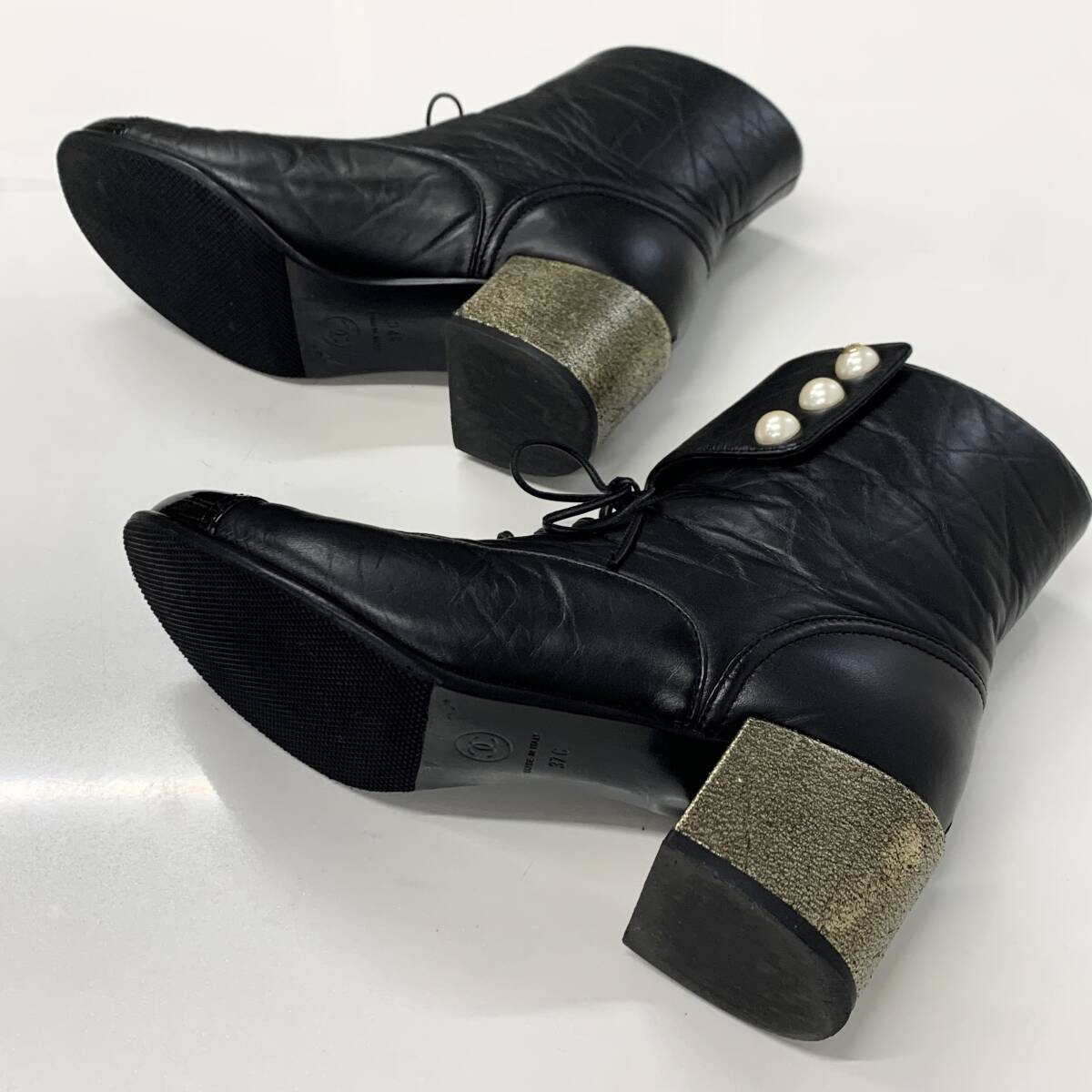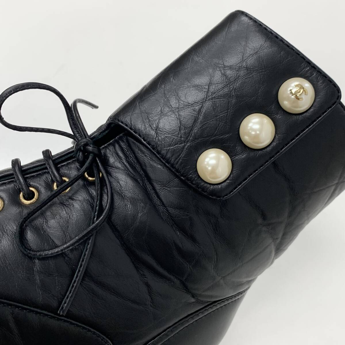 シャネル レザー ココマーク パール シワ加工 レースアップ ショートブーツ ブラック