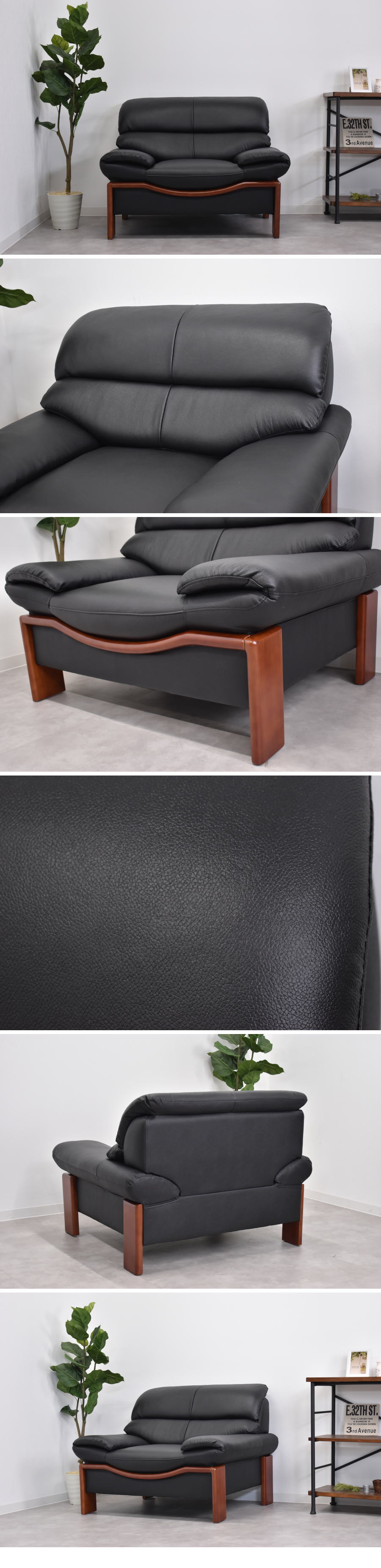 ブラック本革1Pシングルソファーです。 主に肌に触れる部分には本革を使用し、使い込むほど革本来の味・風合いが出てきます。 肘掛・座面下の天然木がお洒落で高級感あります。 座面はSバネ&ウェービングベルト&ウレタンで適度な反発があります。 |