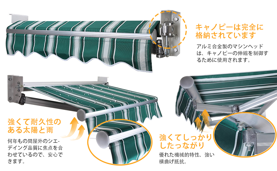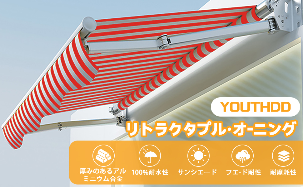 【材質特性】オーニング ブラケットは高品質のアルミニウム合金で作られています、頑丈で耐久性があり、高い安定性を誇ります。格納式日よけ は高密度の通気性に富み、耐光性があり、変形しにくい特性を備えています。