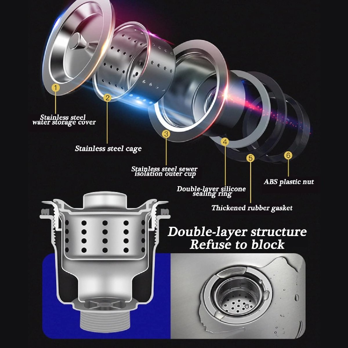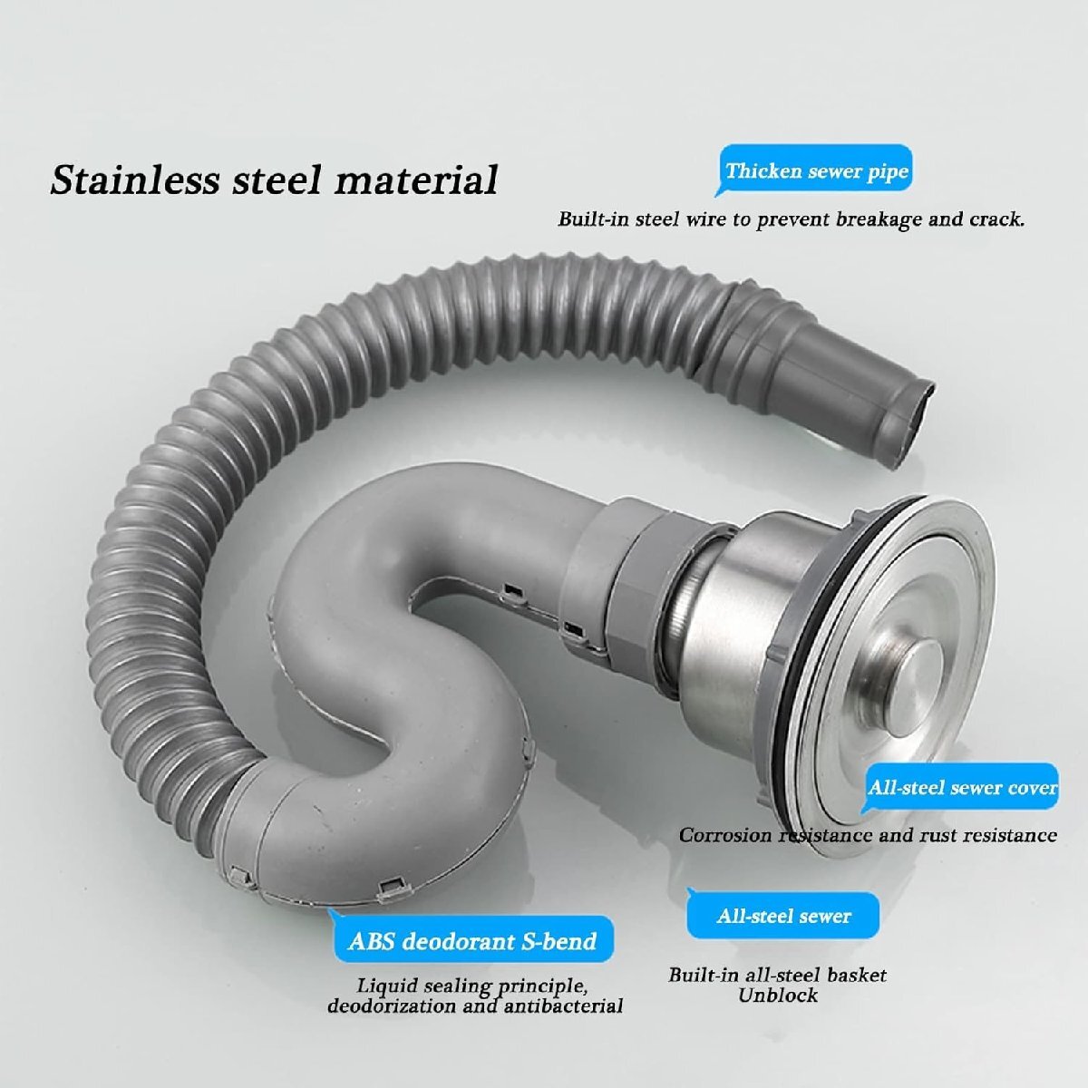 詳細設計:当社のステンレス製水道管にはフィルターバスケットが装備されており、ゴミをろ過し、素早く排水し、詰まりにくいです。Sベンド配水管設計により、臭いの逆流を防ぎ、キッチンやバスルームの臭いを効果的に防ぎます。