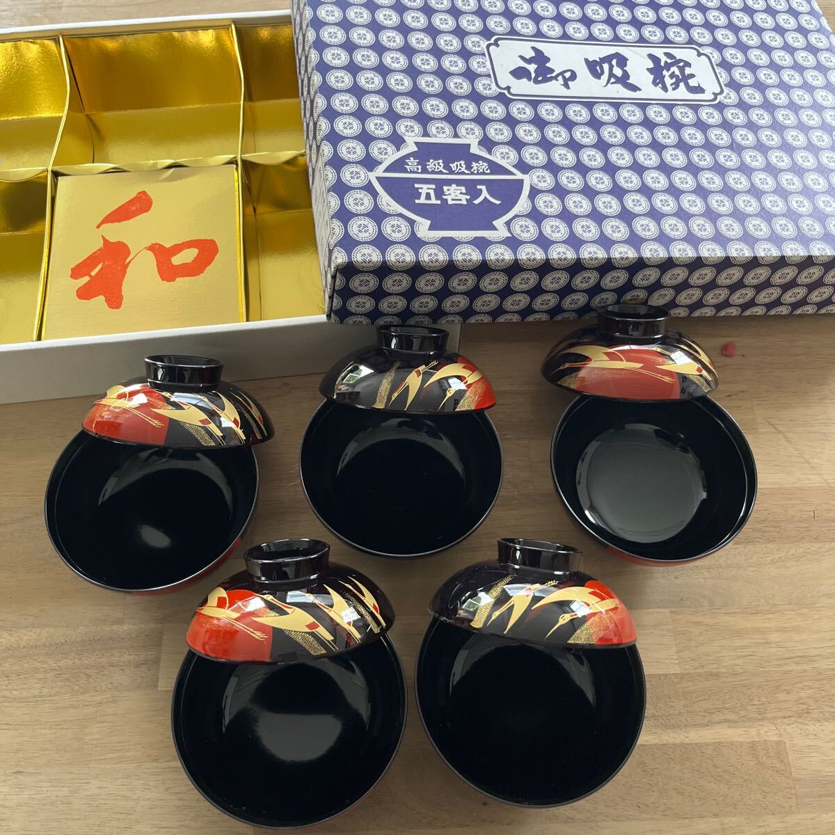 和食器 汁椀 吸物椀 鶴 日の出 5個セット 蓋付き 日本  食器 箱入り