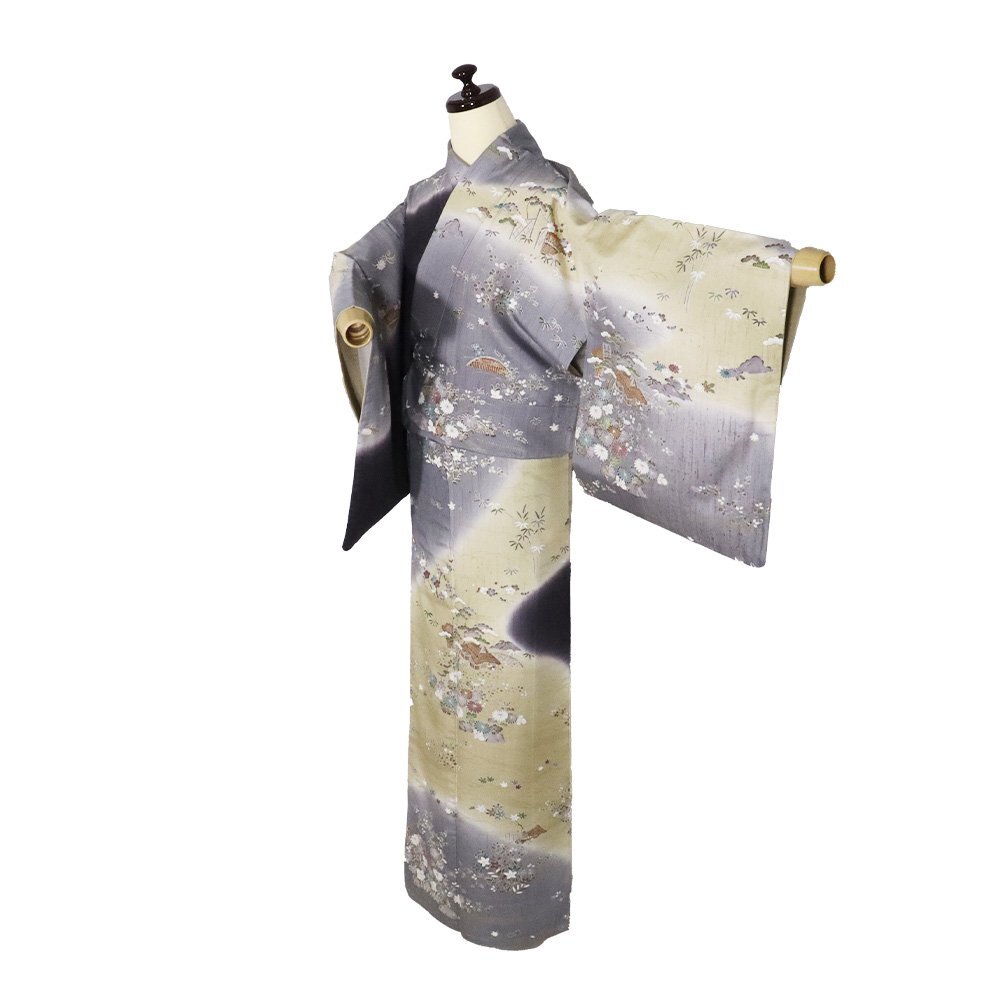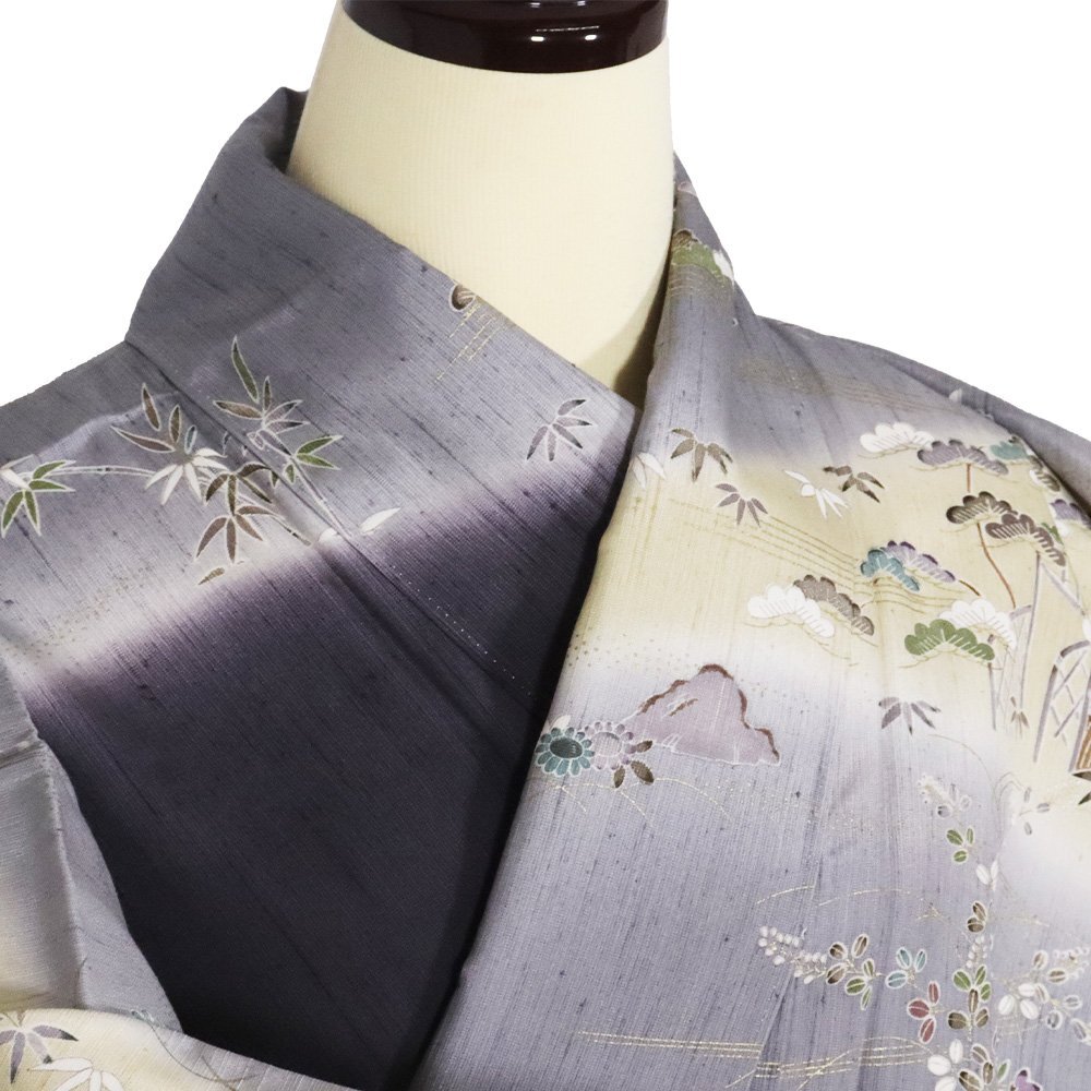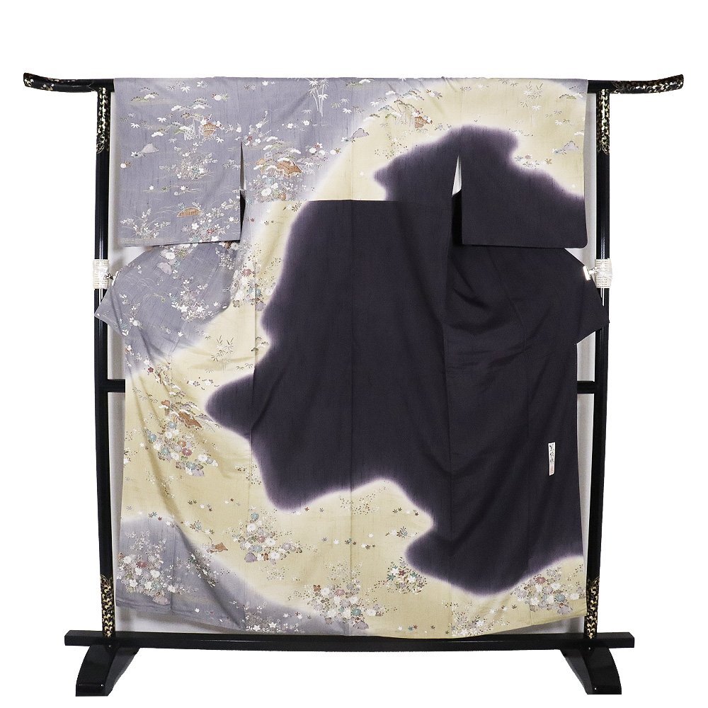 | 手織り紬 訪問着 袷 濃い紫(紫紺色)・ベージュ(飴色)・薄グレー(藤納戸色)・暈し地 茶屋辻・松竹梅・菊・桔梗 161 広襟 作家落款入り | |