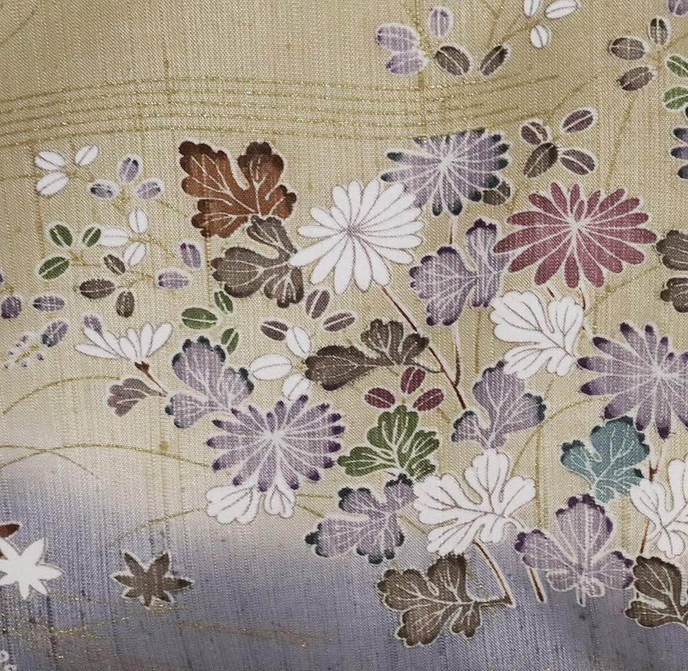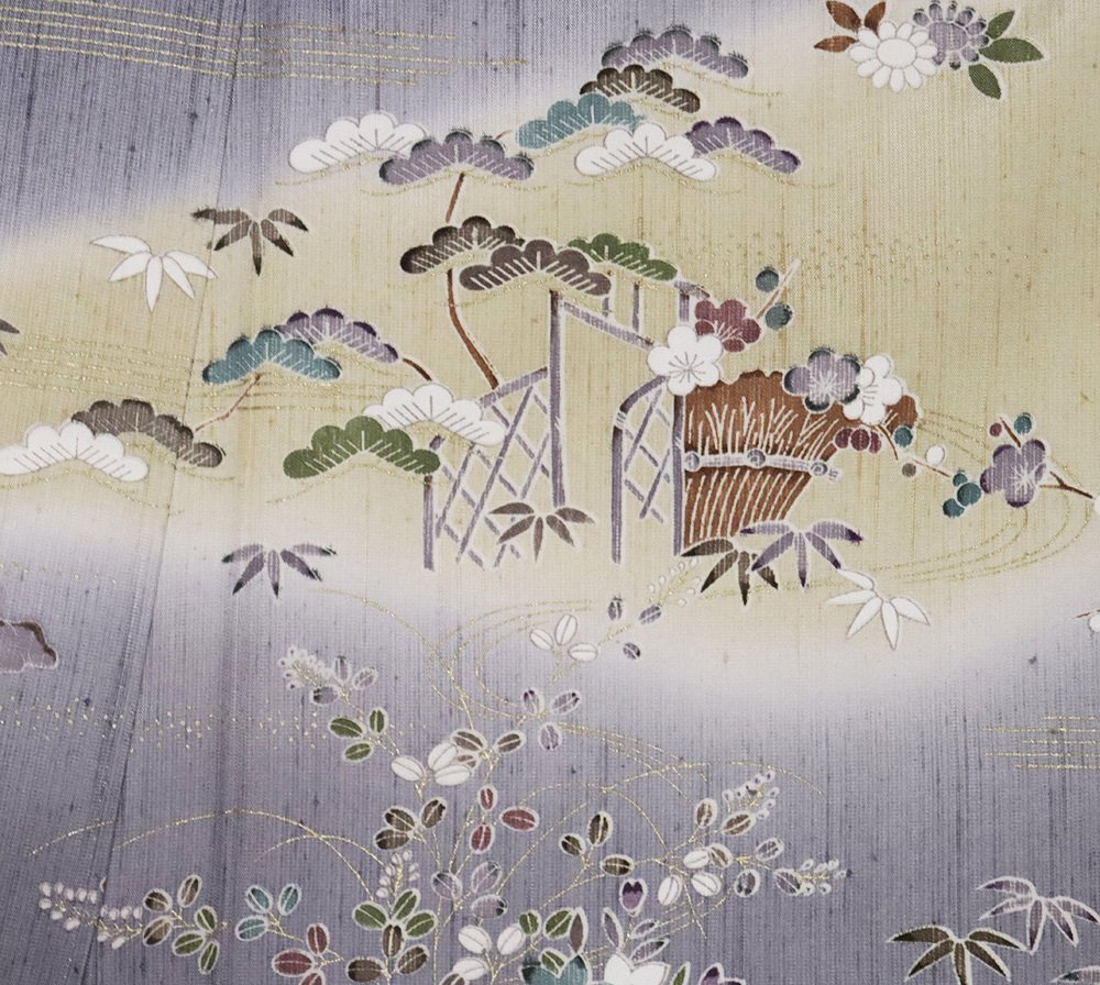 | 色・柄 | 手織り紬 訪問着 袷 濃い紫(紫紺色)・ベージュ(飴色)・薄グレー(藤納戸色)・暈し地 茶屋辻・松竹梅・菊・桔梗 (写真では上手く色が出ない場合があります。ご了承下さい) |