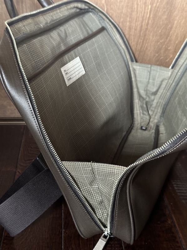素材|タグがないので不明です。皮革のようですが、表面加工されており、傷がつきにくく、雨も浸透しにくい素材に見えます。付属のロングショルダーはナイロンだと思います。