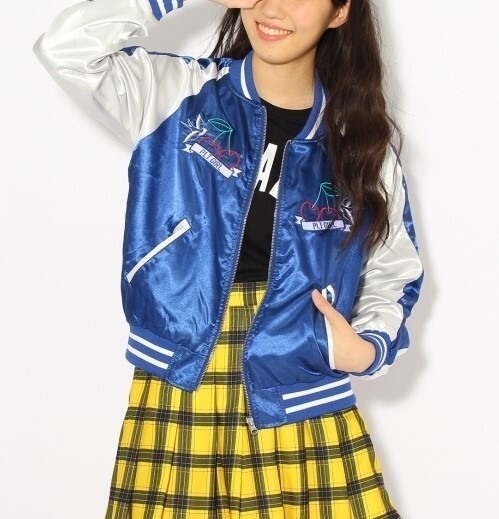 新品 PINK-latte ニコラ掲載チェリー刺繍サテンスカジャン ブルー(092) 15(XS150cm) 定価5390円