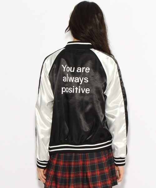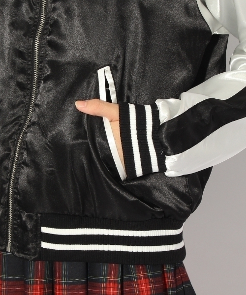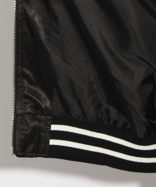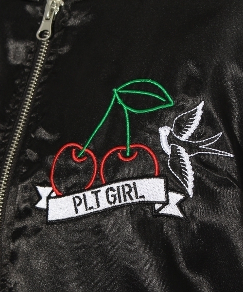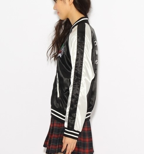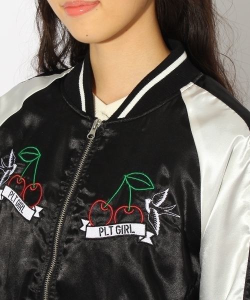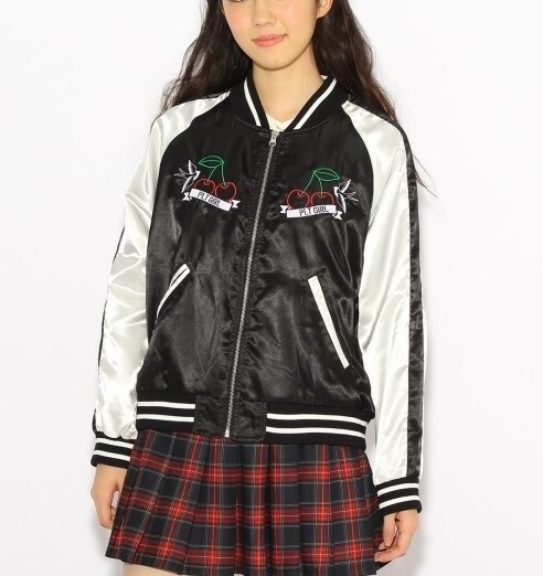 胸元にあしらわれたチェリーの刺繍がインパクトを与えるスカジャン。