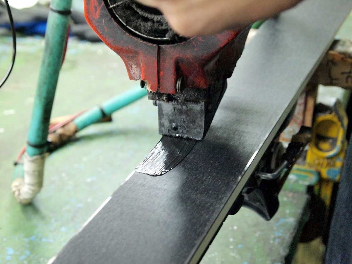 ●滑走面のノーズからテールまで均等に研磨し、ダメージのある古い滑走面を取り除きます。古くなった表面 を薄くスライスするイメージです。スライスの厚みはソールやベースエッジのダメージに応じて調整します。凹 凸のあるソールはこの工程で、まずフラットに近づけます。またこの 工程で比較的浅いすりキズ、線キズを取り除きます。熟練を要する重要な工程です。 |