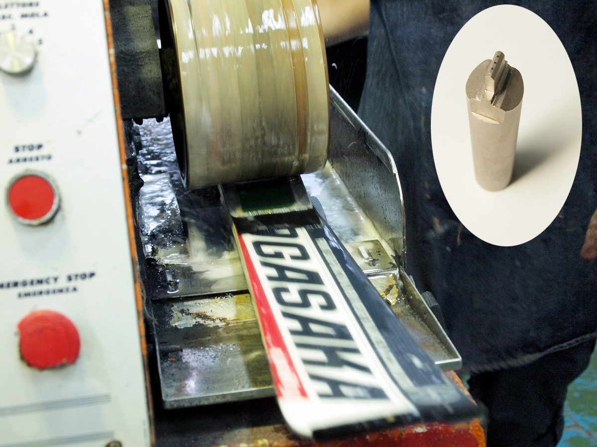 ●専用リペアマシン「エクストゥルダー」でキズを修復している画像。 えぐれた、深い傷には「ソールリペア」で対応します。リペア材料には滑走面と同じ[P-TEX」を使います。それ を250℃前後の高温で溶かしてソールに溶着していきます。修理した部分にもWAXが浸透する優れた補修材 を使用しています。 |