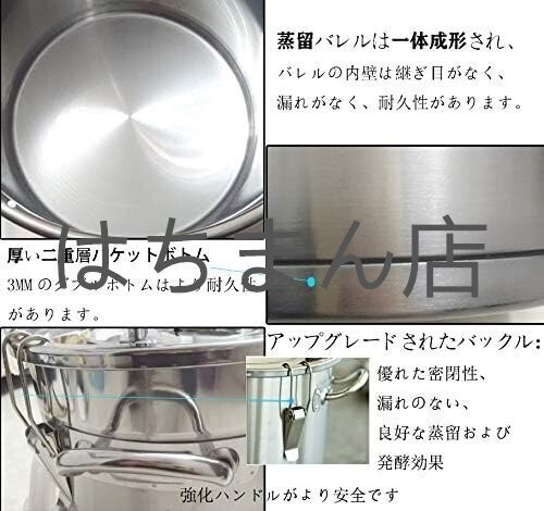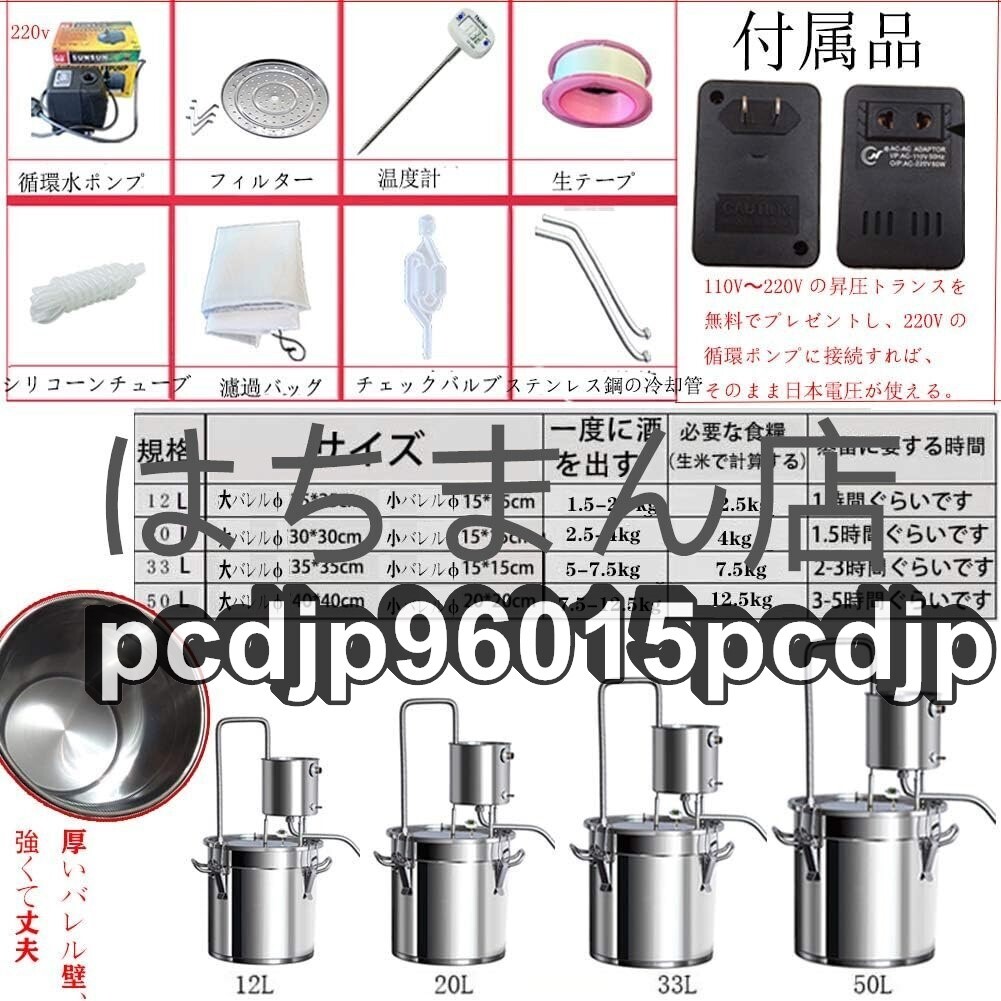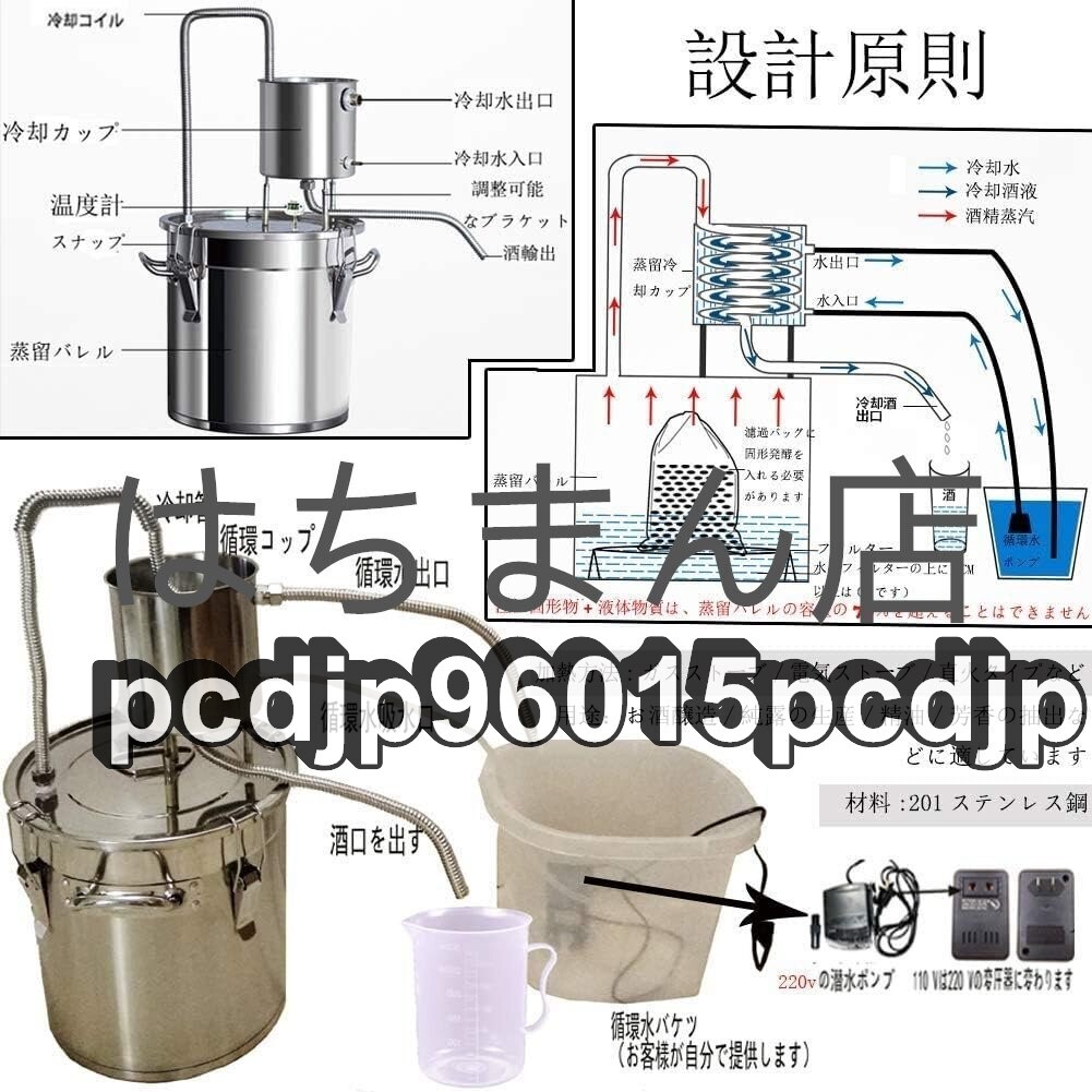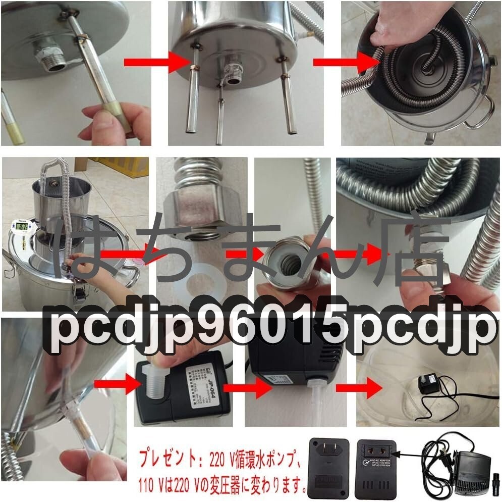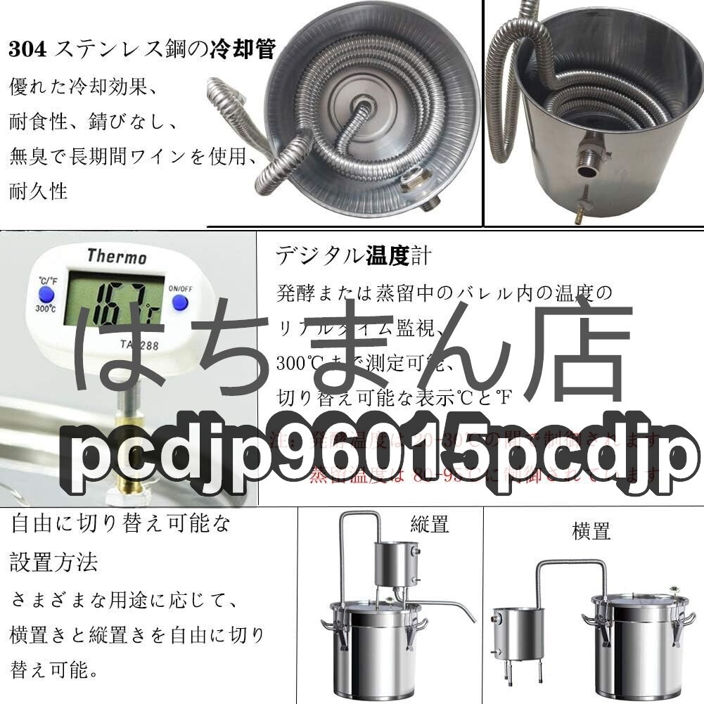 状態:新品未使用 材料:201ステンレス鋼、 美しいデザイン、耐久性、掃除が簡単、さびを防ぐ、耐食性。.せいしゅ、お酒の醸造、ブランデーの醸造、純露の生産、精油、芳香 の抽出などに適しています。 デジタル温度計付き:300℃まで測定可能で、 ℃との切り替えも可能です。注:発酵温度は20-30℃に制御され、蒸留温度は80-95℃に制御されます。 3種類の加熱方法:ガスストーブ/磁炉/直火タイプなど、便利で実用的です。厚いダブルボトムバケット:蒸留バレルの内壁は一体成形されており、バレルの内壁は漏れのないシームレスで耐久性に優れています、添付の3MMダブルボトムはより耐久性があります。 優れた冷却効果:304ステンレス鋼製の冷却コイル、錆のない、速い熱伝導、均一な熱、速い熱放散、ワインのより良い香り。付属品:110V~220V昇圧変圧器*1、220Vの循環水ポンプ*1,日本電圧を直接使用できます。 自由な組み合わせ:循環カップは移動できます。アプリケーションシナリオに応じて、酒蒸留器を水平または垂直に変更できます。家族、研究室、美容院、ホテル、学校などに適しています. ★商品写真はできる限り実物の色に近づけるよう努めておりますがご使用のPCモニター設定や部屋の照明により多少、色の変化が感じられる場合がございます
