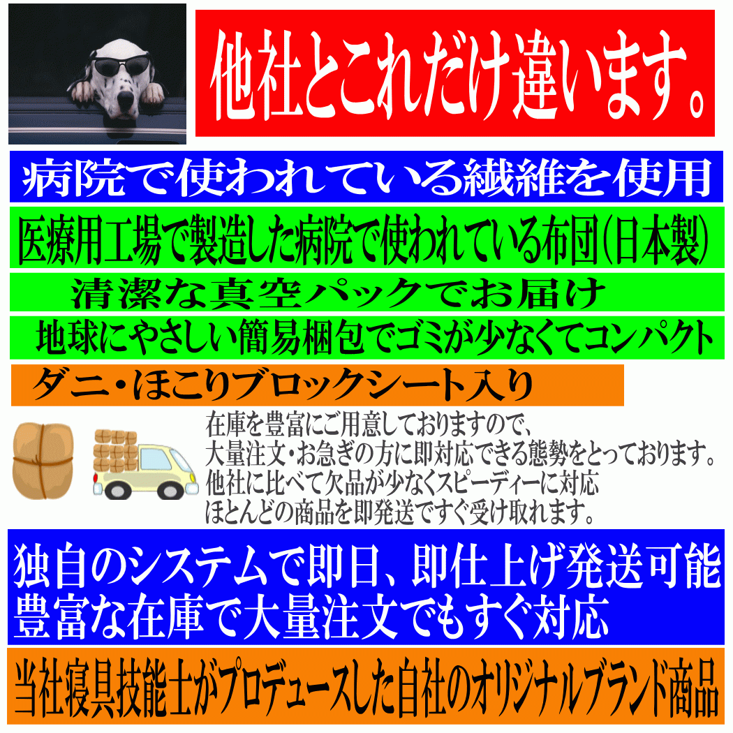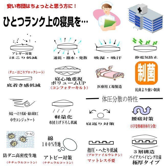 この布団は抗菌より強い制菌防臭加工で医療用布団工場で製造した日本製の軽量3層の 病院、ホテル、施設、託児所