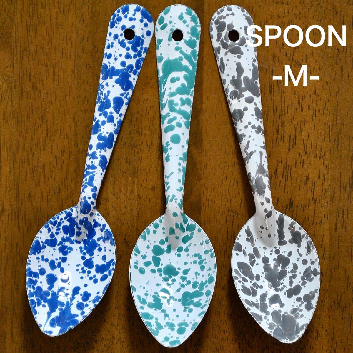 スプラッターパターンと呼ばれる独特の飛沫模様が魅力のホーロースプーン【Mサイズ】3色セットです。