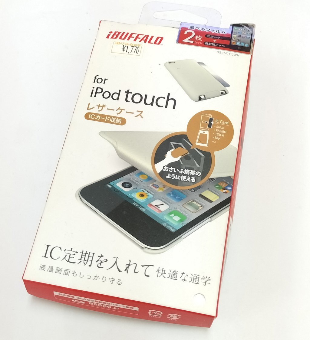 iBUFFALOが販売していた iPod touch2010/2011年モデルのレザーケースです。カラーはホワイト、保護フィルムは光沢タイプと反射防止タイプの2枚付きです。