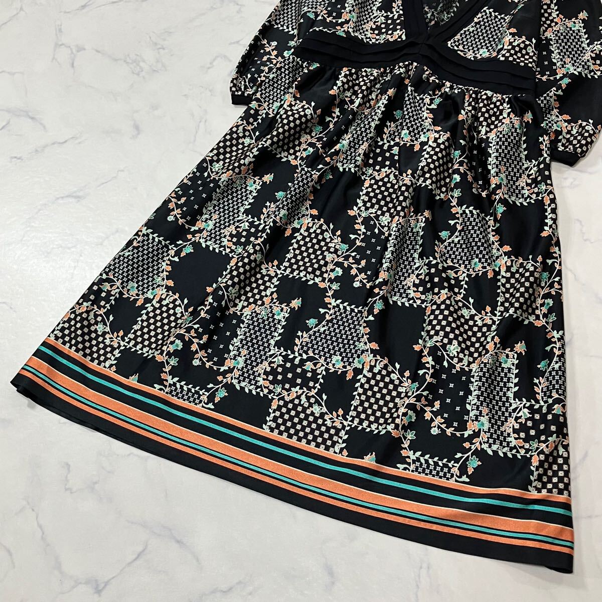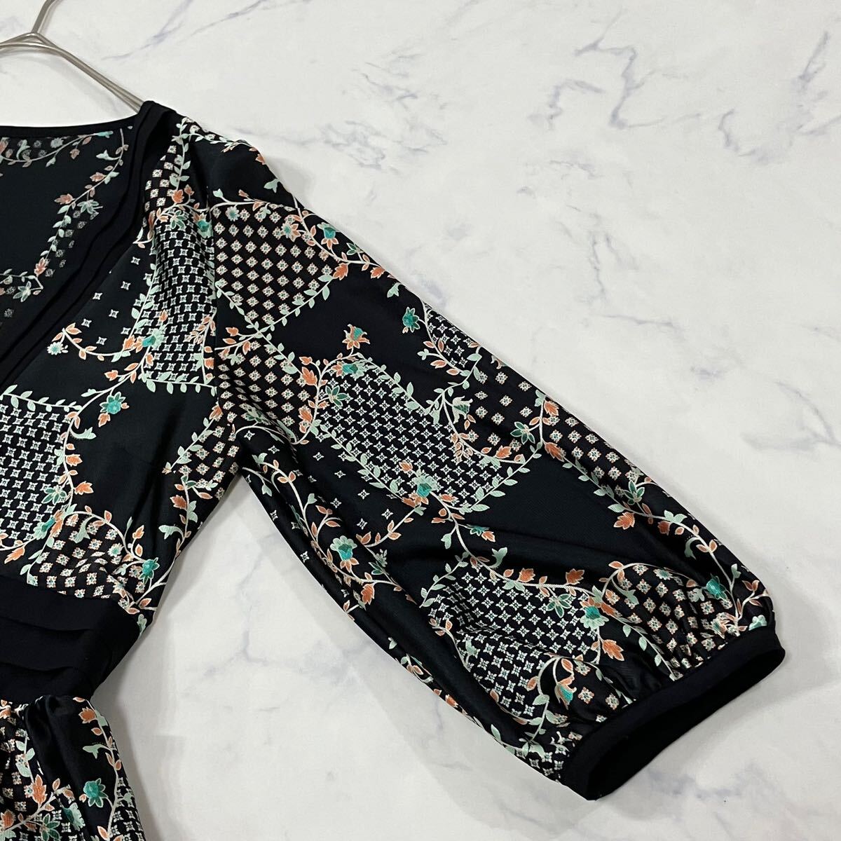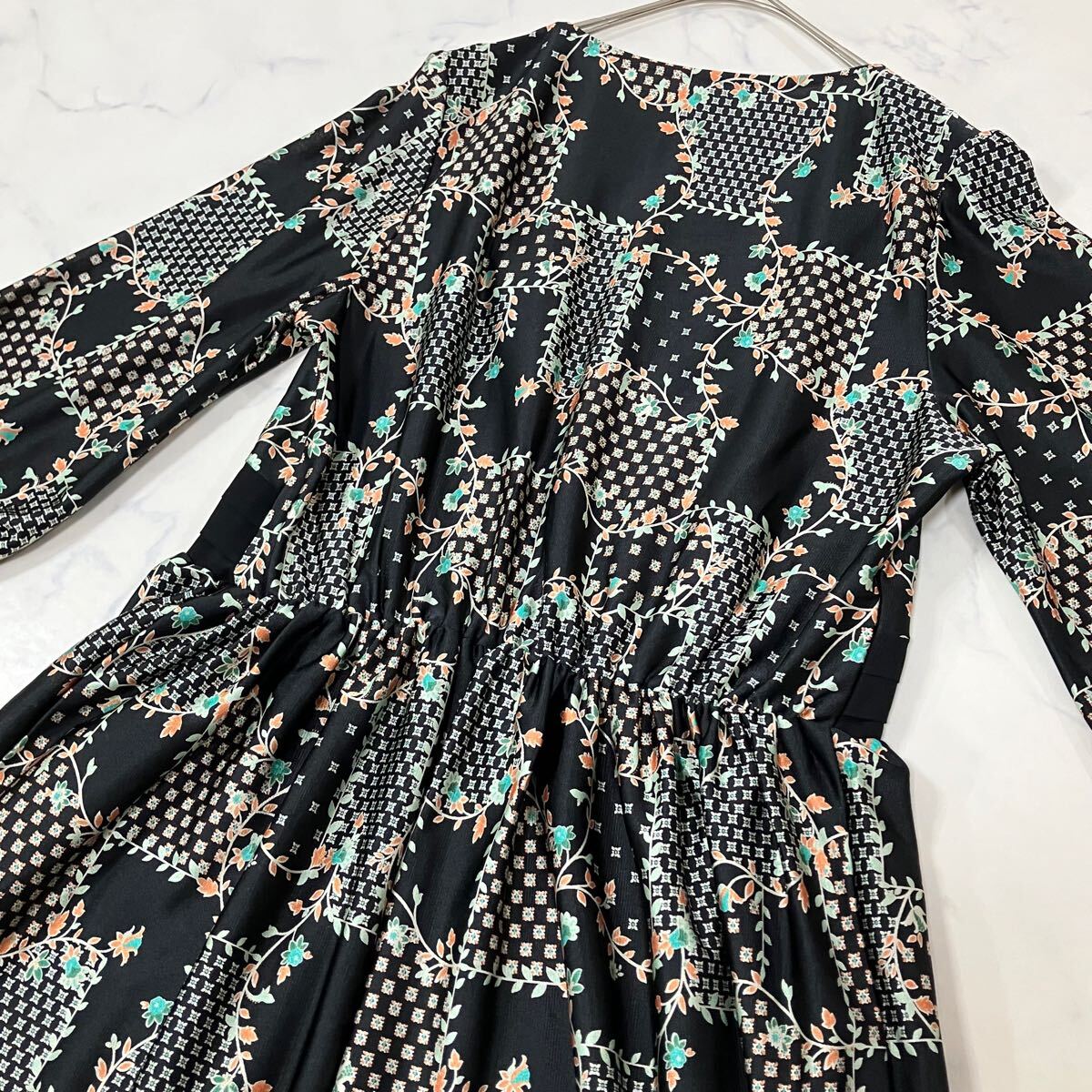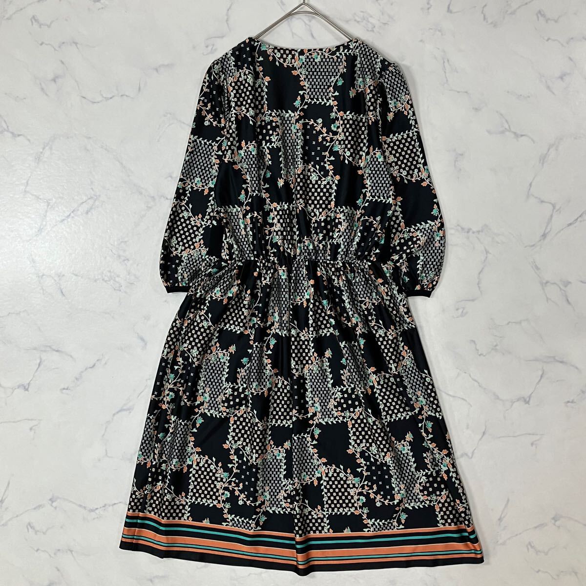 日本製 切替 花柄 後ろウエストゴム ピンタック ダーツ ギャザー Vネック 七分袖 ひざ丈 ワンピース