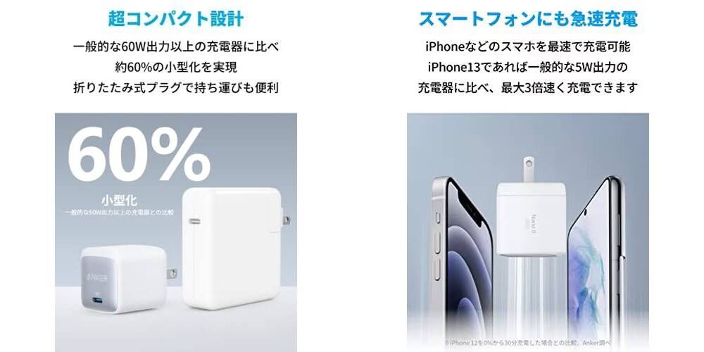 | 商品説明 | Anker アンカー USB急速充電器 Anker Nano II 65W A2663N21 [PowerIQ 3.0(Gen2)搭載 USB PD(パワーデリバリー)対応 65W USB-C×1ポート 可動プラグ採用 ホワイト] です。正規品。 国内大手家電量販店購入の新品未開封品です。 メーカー保証書未記入に販売店保証明細付属。 即決です。消費税はかかりません。 2024年2月から18か月保証付。 (anker公式サイトに会員登録で最大24か月保証) ◆製品 ■スマートフォン、ノートPC、タブレット端末の充電に、これ1つ USB Power Delivery(PD)対応の65W出力を備え、 スマートフォンからノートPCまで幅広い機器に急速充電ができます。 利用機器毎に異なる充電器を持ち運ぶ必要はありません。 ■iPhoneやAndroidスマホにも急速充電 一般的な5W出力の充電器に比べ、3倍速く充電できます (iPhone 14を0%から50%まで充電した場合での比較)。 USB Power Deliveryにも対応しておりGalaxy S22など USB PD対応のスマートフォンへの急速充電も可能です。 ※ 本製品にはモバイルバッテリー機能はございません。 ■スマートなビジネススタイルへ 手のひらに収まる超コンパクト設計で、 カバンやポケットにスムーズに収納できます。 リモートワークや出張などの持ち運びに便利です。 ■MacBookやPD対応のWindows PCにも対応 最大65W出力を備え、MacBookだけでなく、 PD対応のさまざまなWindows PCにも急速充電できます。 一般的なWindows PCに同梱されているACアダプタに比べて 非常に軽量かつコンパクトなサイズを実現しました。 ■独自技術「Anker GaN II」を採用 約2年の研究開発を経て GaN(窒化ガリウム)搭載USB充電器が第二世代に進化。 電源ICと回路設計に革新を起こし GaNの持つ素材の力をさらに引き出したAnkerの独自技術です。 スイッチング周波数を約2倍に高めて電子部品を省サイズ化するとともに、 高周波化の弊害として発生する熱およびEMI(ノイズ)を、 内部基板部品の立体配置と回路構造の 最適化(PCBA 3D スタッキング)で抑えました。 結果として、厳しい安全基準を満たしながらさらなる小型化に成功しました。 ■国際的な安全規格にも準拠 国際的な安全規格であるIEC 62368-1の基準に準拠しています。 過電圧保護や電子回路のショート防止、温度管理など、 Anker独自の多重保護システムにより、 長く安全にお使いいただけます。 ■幅広い対応機種 Anker独自技術のPowerIQ 3.0(Gen2)を搭載。 USB Power Deliveryとの互換性をさらに高めながら、 Qualcomm Quick Chargeなどの充電規格にも対応しています。 iPhoneやiPad、MacBook、Apple WatchなどのApple製品を含む、 幅広い機器へフルスピード充電できます。 ■折りたたみ式プラグ搭載 折りたたみ式プラグを採用し、コンパクトなデザインに仕上げました。 旅行や出張など、持ち運びにも便利です。 ■ご注意 ・USB急速充電器は付属しておりません。 ・本製品はMacBook Pro 16インチに対応していますが、 付属の充電器より充電スピードは低下します。 ・本製品にはモバイルバッテリー機能はございません。 ・アルコール濃度の高い液体が長時間付着すると、 製品表面にしわが発生する可能性があります。 お手入れの際は除菌用ウェットティッシュ等のご利用はお控えいただき、 乾いた布をご使用ください。 ■対応機種 ●スマートフォン ・iPhone 14/14 Plus/14 Pro/14 Pro Max/iPhone 13/ 13 mini/13 Pro/13 Pro Max/iPhone 12/12 mini/12 Pro/ 12 Pro Max/11/11 Pro/11 Pro Max/SE(第2世代)/ XS/XS Max/XR/X/8/8 Plus 他 ・Galaxy S21/S21+/S21 Ultra/S20/S 20+/S20 Ultra/S10/S10+/S10e/S9/S9+/S8/ S8+/Note20/Note20 Ultra/Note10+/Note 10/Note 9/Note 8/Note 7 他 ・Pixel 5/4/4 XL/3/3 XL 他 ●タブレット端末 ・iPad(第9世代)/iPad Air(第4世代)/iPad Pro(12.9インチ)(第5世代)/ iPad Pro(11インチ)(第3世代)/iPad mini(第6世代)他 ●ノートPC ・MacBook Air(M1、2020)/Air(Retinaディスプレイ、 13インチ、2020)/Pro(13インチ、M1、2020)/ Pro(14インチ、2021)/Pro(16インチ、2021)他 ・Dell XPS 15/XPS 13/Inspiron 15/Inspiron 14 他 ・Lenovo ThinkPad X1/X390/E490/ IdeaPad Slim 550/IdeaPad Flex 550 他 ・HP EliteBook x360/Spectre x2 12インチ/ Spectre x360 2019/Spectre Folio/Pavilion 15-eg/Pavilion 14-dv 他 ・NEC LAVIE VEGA/LAVIE Pro Mobile/ LAVIE Note Mobile/LAVIE First Mobile 他 ・Huawei MateBook 13/MateBook X/MateBook X Pro 2019 他 ・その他USB Power Delivery対応のノートPCに幅広く対応しています ●その他対応機種 ・Apple Watch 他 ◆詳細はメーカーサイトで確認して下さい ・トップページ https://www.ankerjapan.com/products/a2663?variant=41246414504097 ・メーカーサイトの製品紹介公式動画(YouTubeチャンネル) https://www.youtube.com/watch?v=kQd0QYbsOI4 *** 『あなたがアクセスしようとしているリンク先は Yahoo! JAPANのサイトではありません。 IDやパスワードを要求するサイトにご注意ください。』 と表示されますが、気にしないでください。 リンク先は個人のサイトではなくメーカーサイトです。 |
