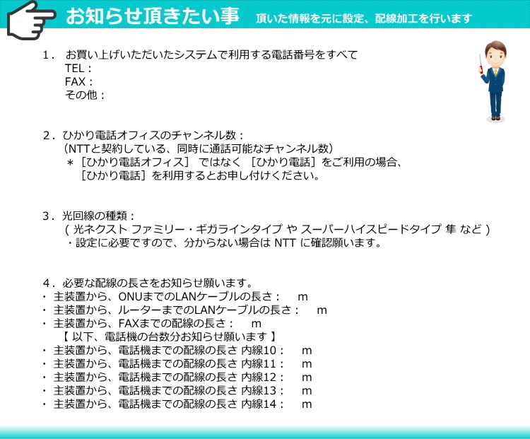 ・ 今使っているビジネスフォンの[ 既存の配線 ]を使いたいのですが大丈夫でしょうか? ・ 1台をデジタルコードレスに変更した際の見積もりがほしい。 ・ オフィスeo光電話でも使えますか? など、お気軽にお申し付けくださいませ。 など、お気軽にお申し付けくださいませ。 * お問い合わせは、メール info@aimtel.jp でも承ります |