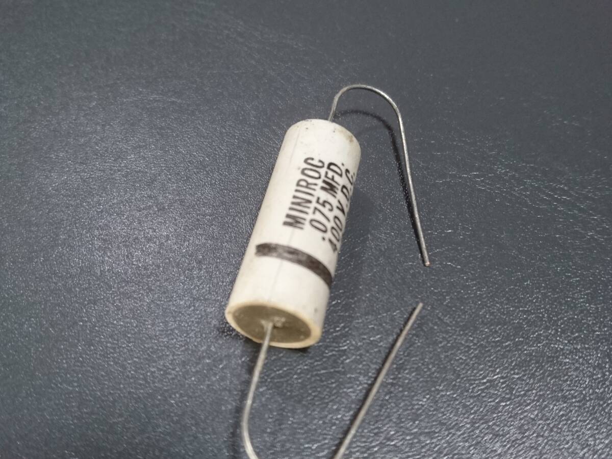コーネルダブラーのビンテージ セラミックシェルタイプ フィルムコンデンサー MINIROC  0.075μF 400V の未使用品です。ひび割れがあります。