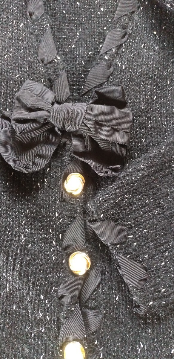 【デザインの特徴】 黒を基調としたこのカーディガンは、リボンと金色のボタンがアクセントとなり、シンプルながらも華やかさを演出します。長袖デザインで、季節を問わず着用可能です。