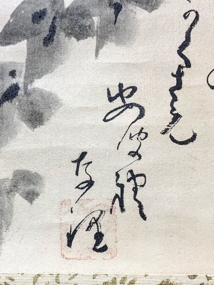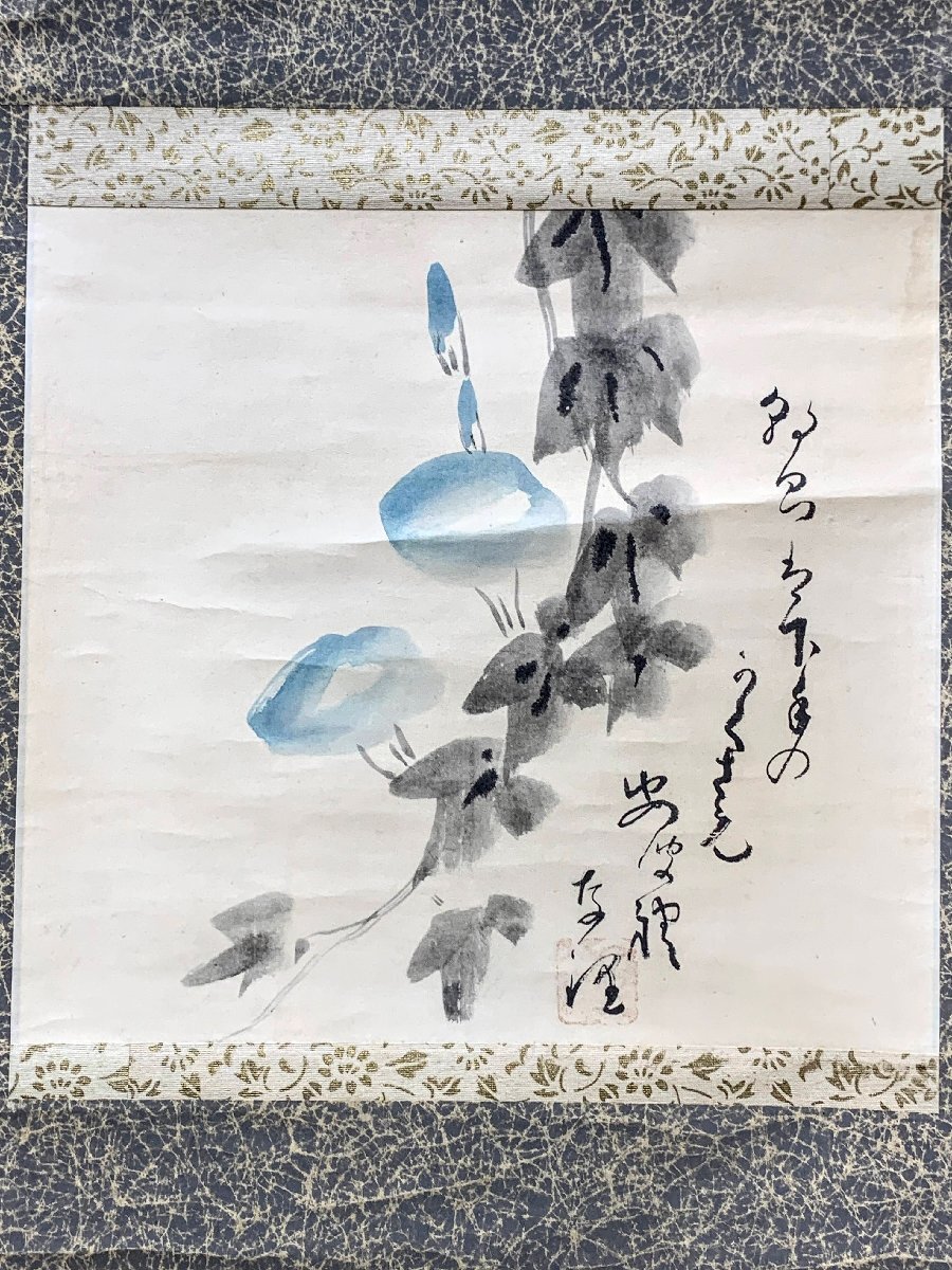 K59/掛け軸 茶掛「朝顔 哥」在銘 竹軸先 肉筆 日本画 茶道具 古美術